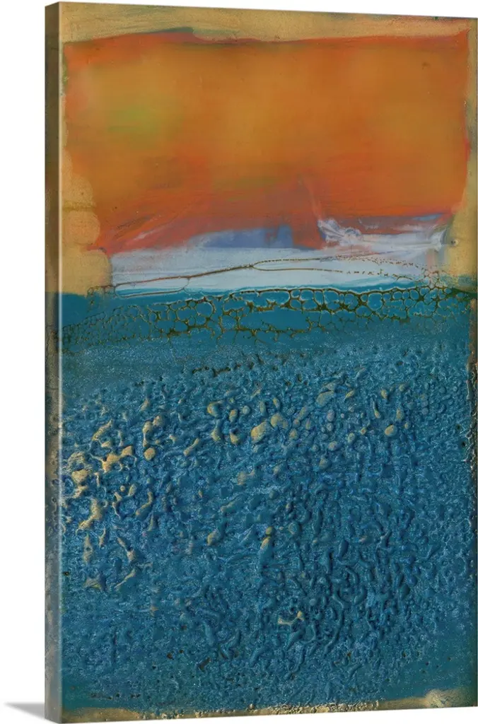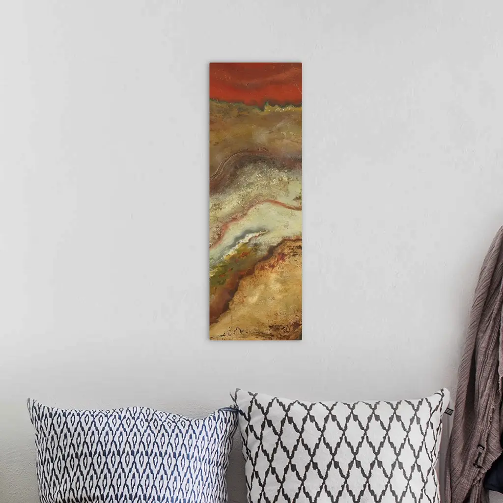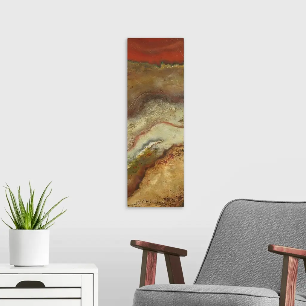 Oversized, vertical, abstract art of jagged, horizontal layers of earth, in various earth tones, divided by squiggling, inconsistent lines.
