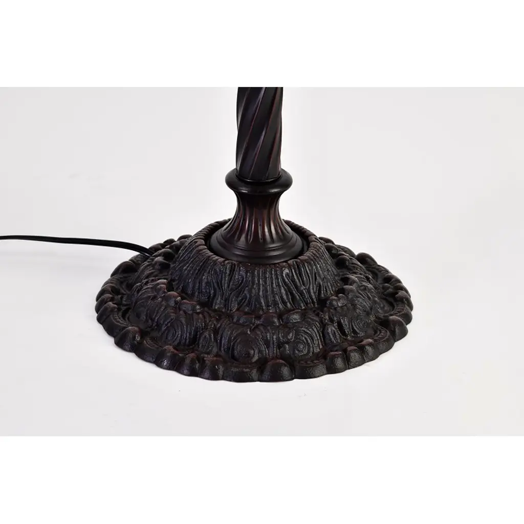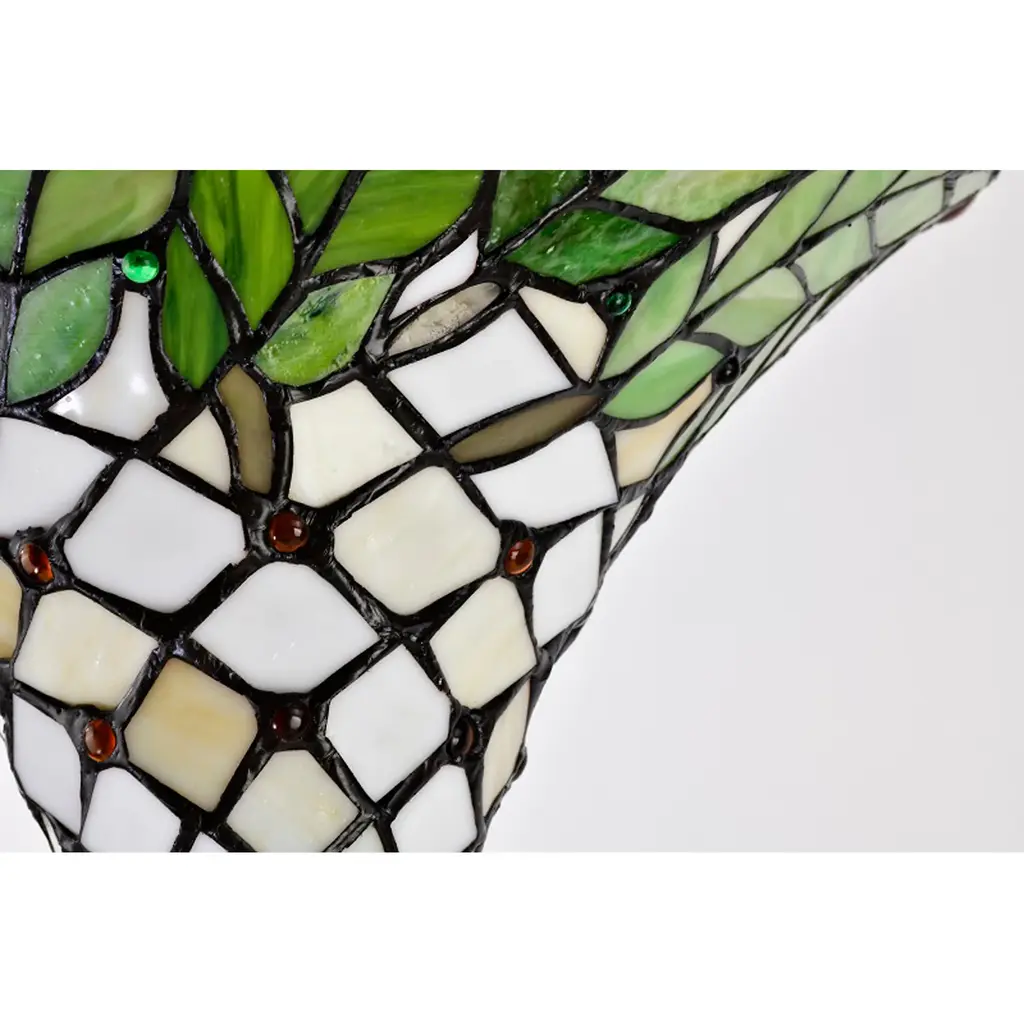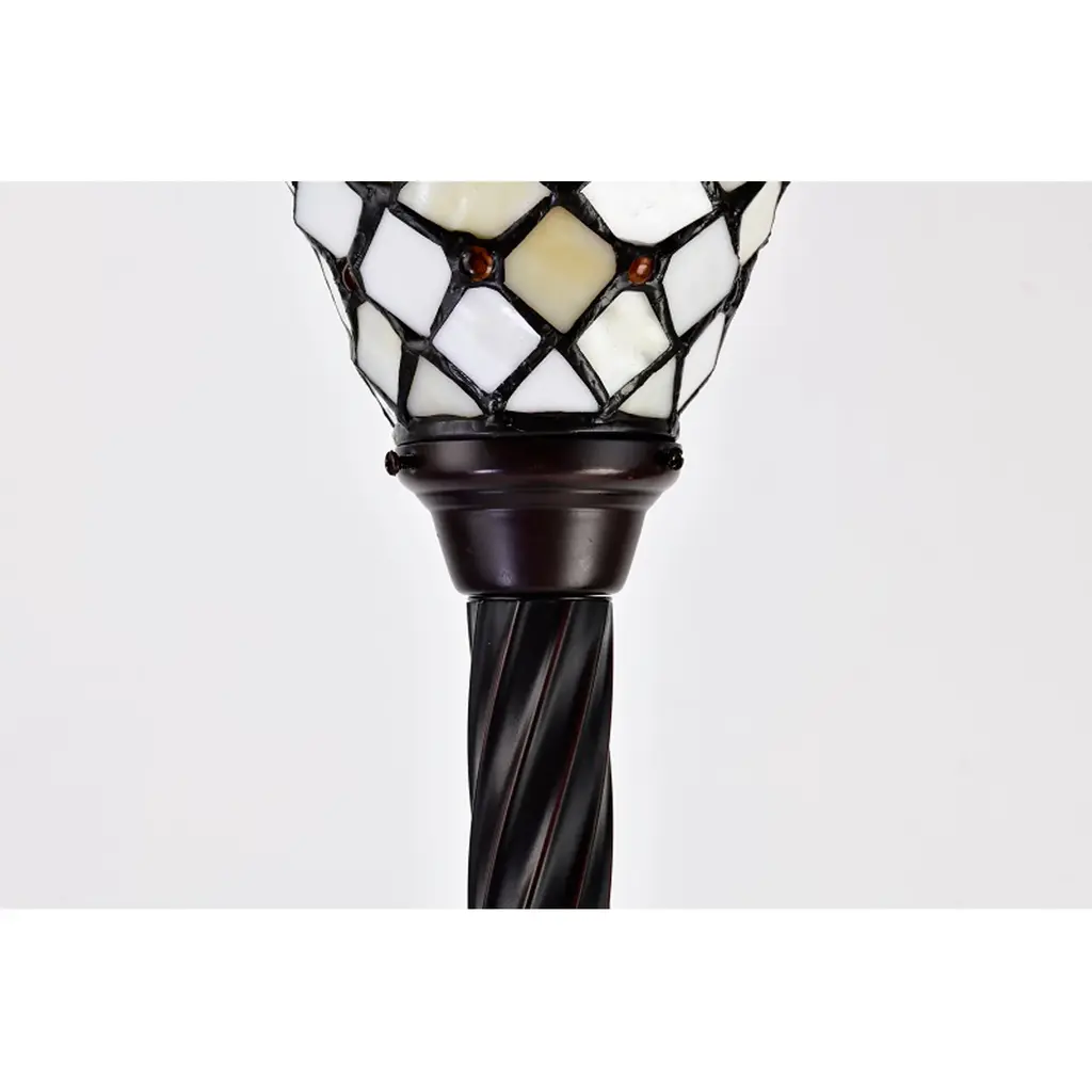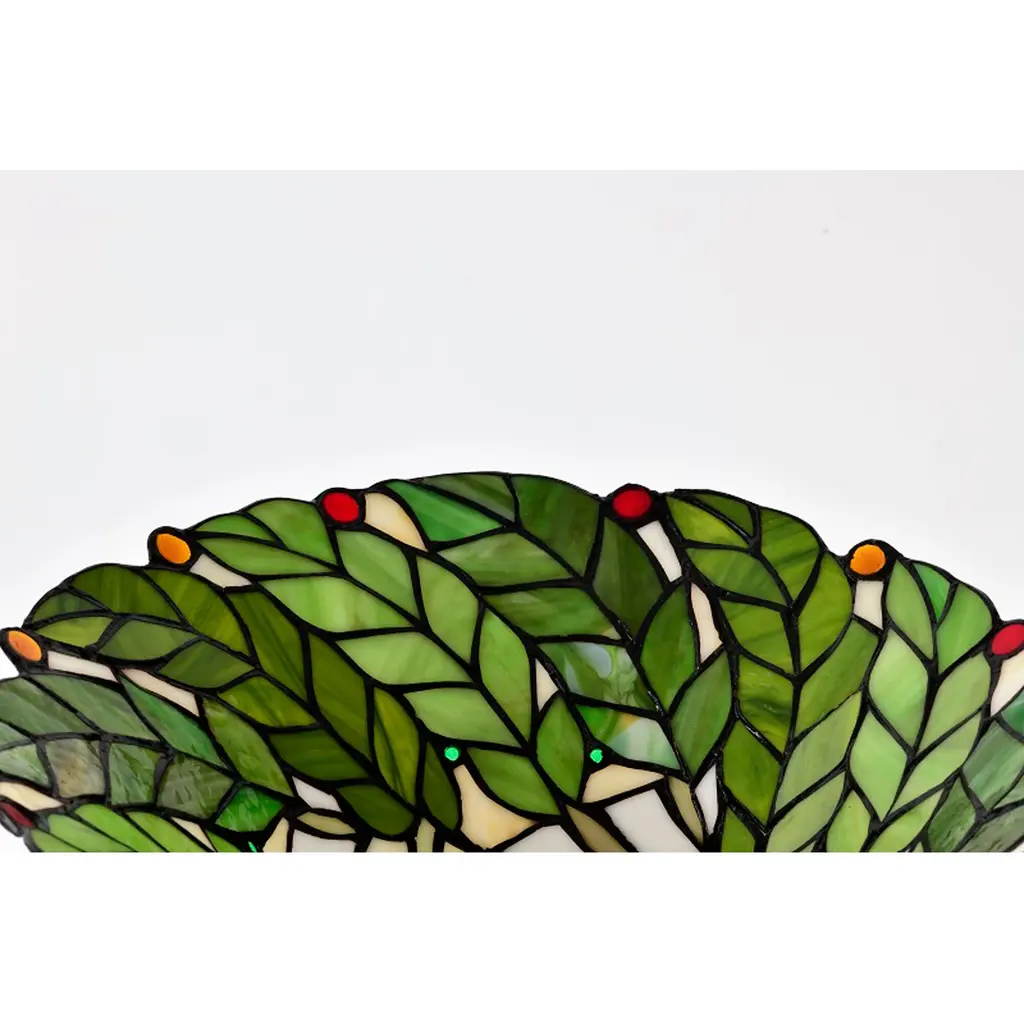Convey refined elegance with this regal Tiffany-style torchiere lamp. Expertly crafted by combining multi-tone, hand-cut glass pieces and wrapping them in copper foil, the shade adds the wow factor to your living space. An iron and zinc alloy base offers robust support, while the bronze finish rounds out the impeccable look. Handcrafted using methods first developed by Louis Comfort Tiffany Shade contains 560 pieces of stained glass, each hand-cut and wrapped in fine copper foil Leaves motif in green, yellow, red, and white Accented by 126 colorful cabochons Elegant bronze finished iron and zinc alloy base Requires one 60-watt bulb (not included) Operates with a foot switch Measures 66 inches high x 15 inches in diameter at shade