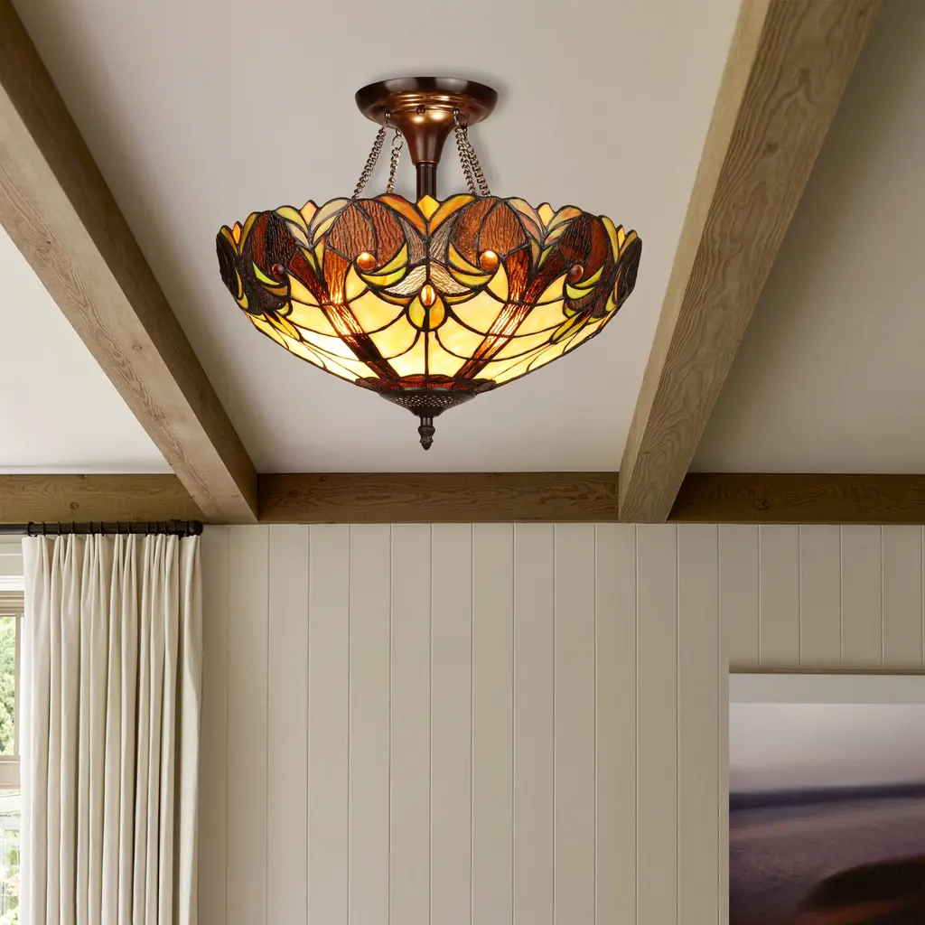 This Tiffany-style, Victorian design 2-light semi-flush fixture features a dark bronze finish that will complement many decors throughout your home. Crafted from 230 pieces of hand cut art glass, 15 glass beads, this piece will add color and beauty to any space. Features: Shade: Tones of Beige, Brown, Amber and Green art glass. Requires: Two (2) 60 Watt max E26 Type A Bulbs (Not Included). Fixture Dimensions: 13.60 inches high x 15.75 inch diameter. Since these are hand crafted products, the exact color of glass pieces may vary. Colors of the glass will appear darker and less vibrant when not illuminated. Handmade glass will vary from one piece to the other; glass made at different times will also vary. Light bulbs used in lamps or ambient lighting may affect the appearance of the products. Stained glass product has been protected with mineral oil as part of the finishing process. Please use a soft dry cloth to remove any excess oil.