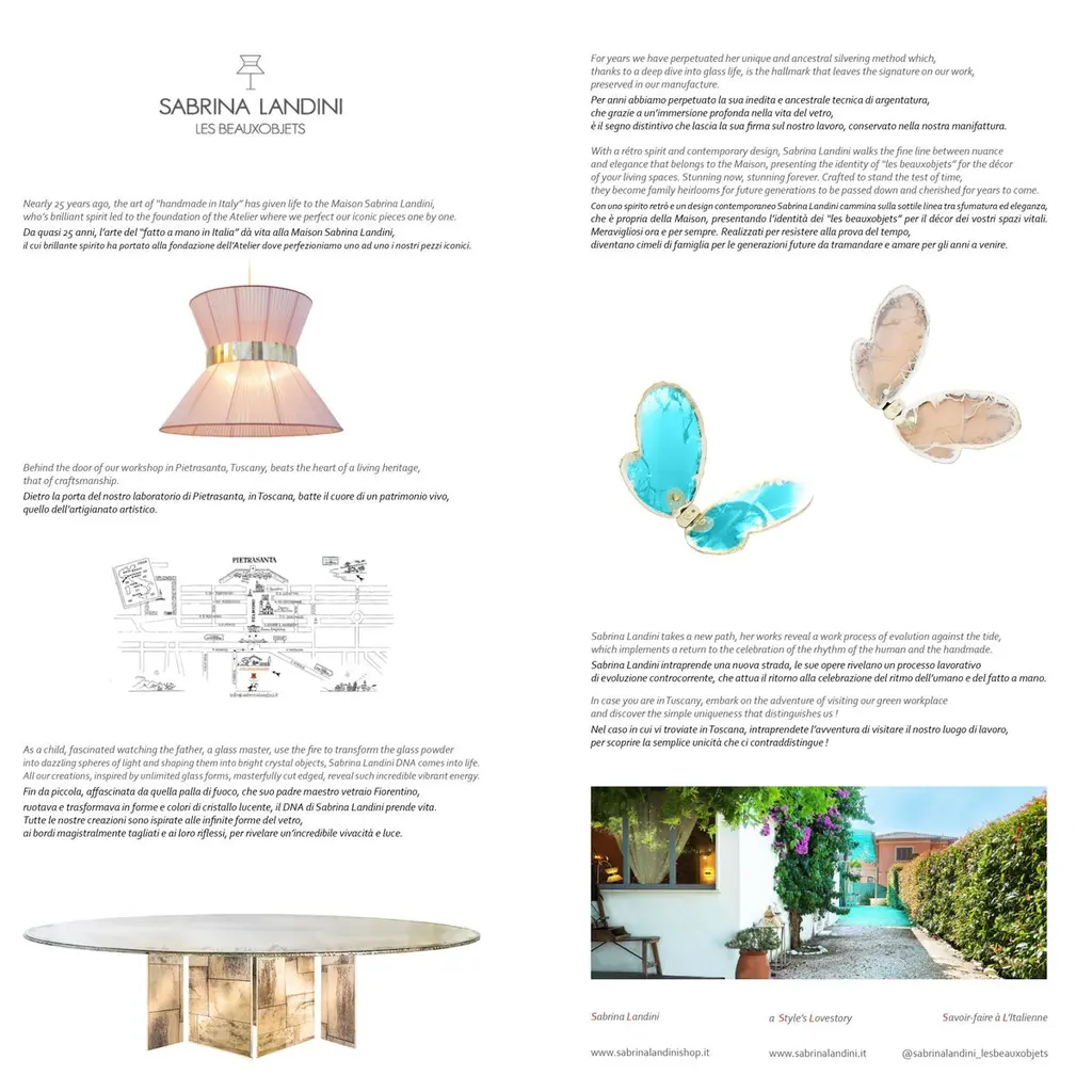 TIFFANY The first one, Audrey inspired the iconicIntroducing Sabrina's breathtaking collection of Tiffany lamps.Year after year Sabrina Landini perpetuates its exceptional expertise, offering much more than a lamp – a touch of originality.Nearly 25 years ago, the first Tiffany lamps were crafted in Sabrina Landini' s workshop, just a stone's throw away from the Milano Navigli. At the House we believe in once-in-a-lifetime Tiffany, the iconic.With its delicate interplay of materials and lines, Tiffany celebrates the art of dazzling and brightening the lives of those you love.The eye-catching glass belt, secretly performed in our Atelier, the variety of silk’ colors and the smooth brass finish, confer uniqueness and natural charme.The perfect balance of allure and sophistication to enrich all kinds of interiors.CE certified and Electrified : US, EU, UK, dimmableAvailable in the lampshade diameter : 23, 30, 40, 60, 80 cm