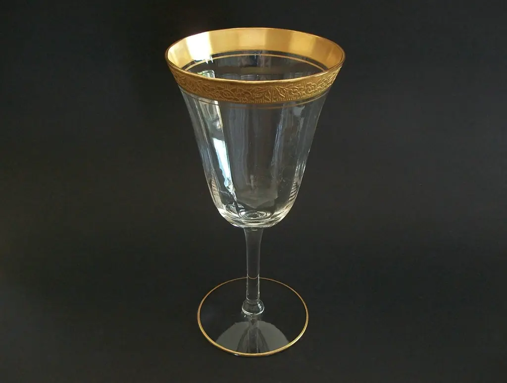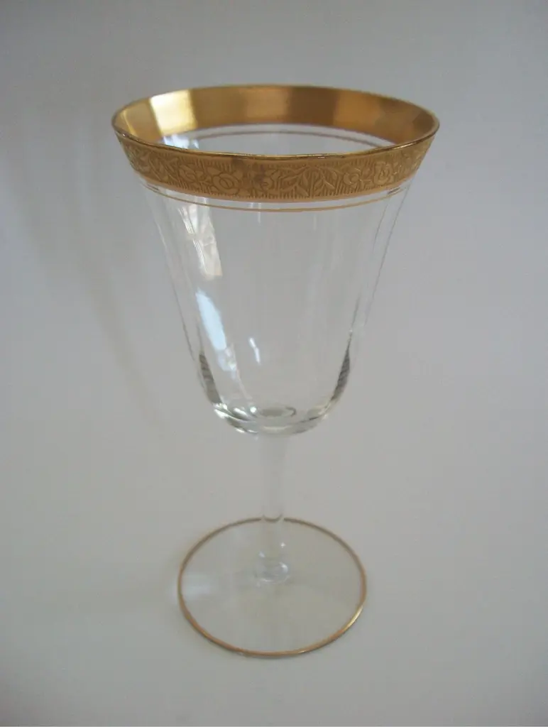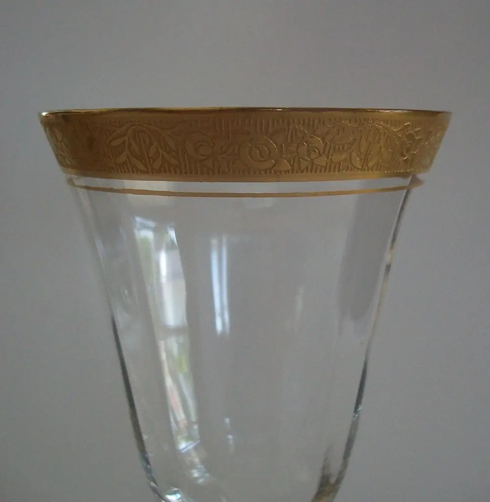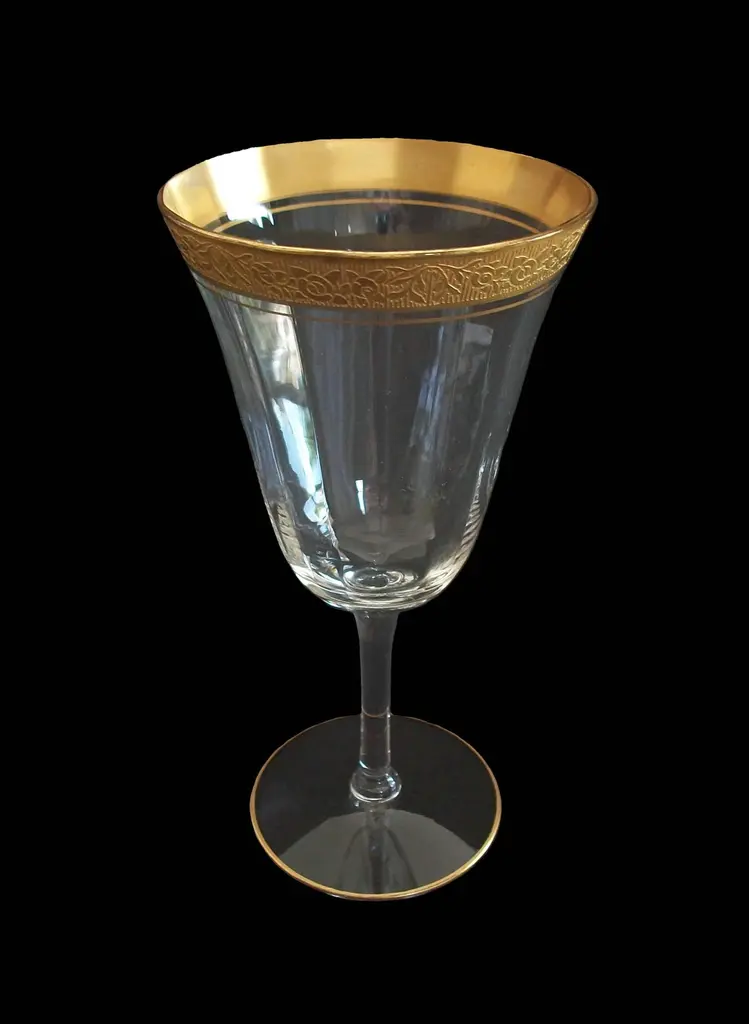 TIFFIN GLASS (Manufacturer) - Rambler Rose Clear (Pattern Name) - Hollywood Regency fine quality needle etched crystal wine/water glass - featuring a floral etched pattern to the 24K gold rim and fine line trim - plain paneled sides - plain base with gold rim detail - unsigned - United States - circa 1950's.Excellent vintage condition - minor gold loss/thinning and scratches - no cracks - no chips - no damage - no restoration - minor signs of age and use.Size/Dimensions - Large - 3 3/8" Diameter x 7" High.Note - Total number on offer is six.