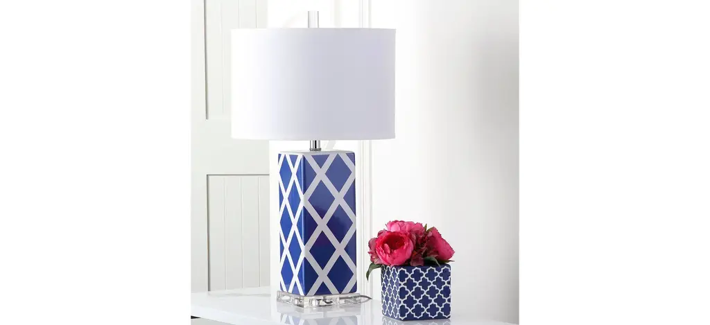 Forever plaid takes on new meaning with the Tig Lattice Table Lamp by Safavieh. Crafted of navy and white ceramic with acrylic base and a silver neck, this graphic windowpane design is topped with a contemporary off white cotton hardback drum shade.