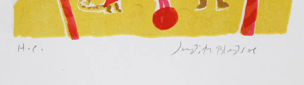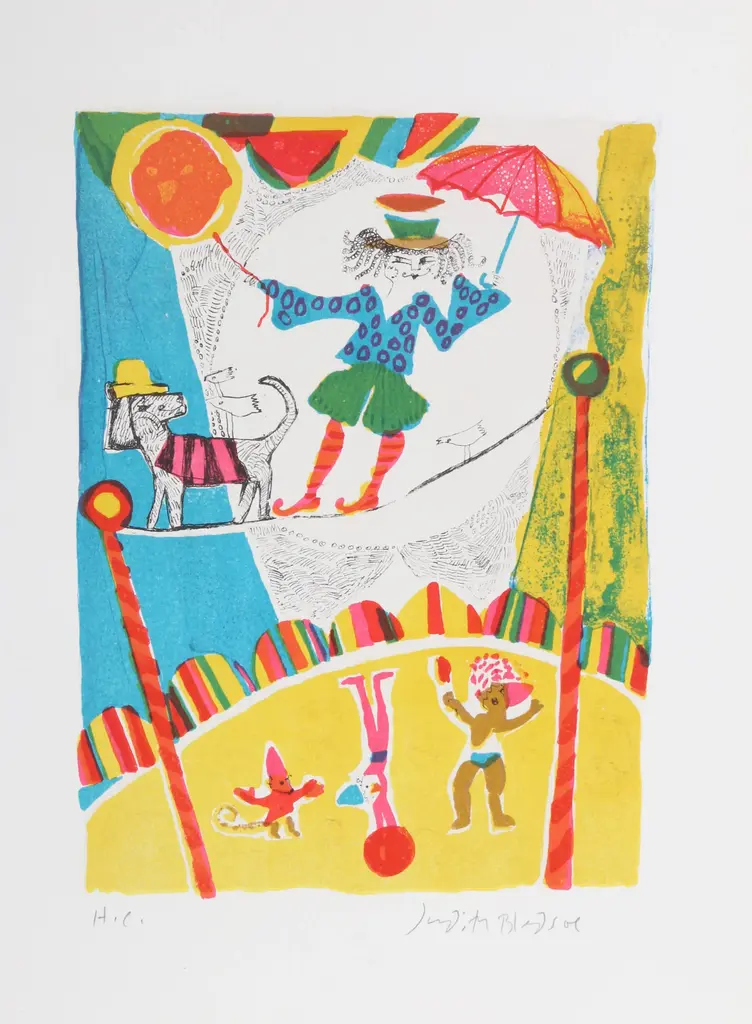 Walking across the tightrope, the walker holds an umbrella in one hand and a balloon in the other as he balances for his life. Ahead of him, his dog turns back to watch and people below in he ring cheer him on. Tightrope Act from A Little Circus Judith Bledsoe American (1938–2013) Date: 1974 Lithograph, signed in pencil Edition of HC Size: 15 x 10.5 in. (38.1 x 26.67 cm)