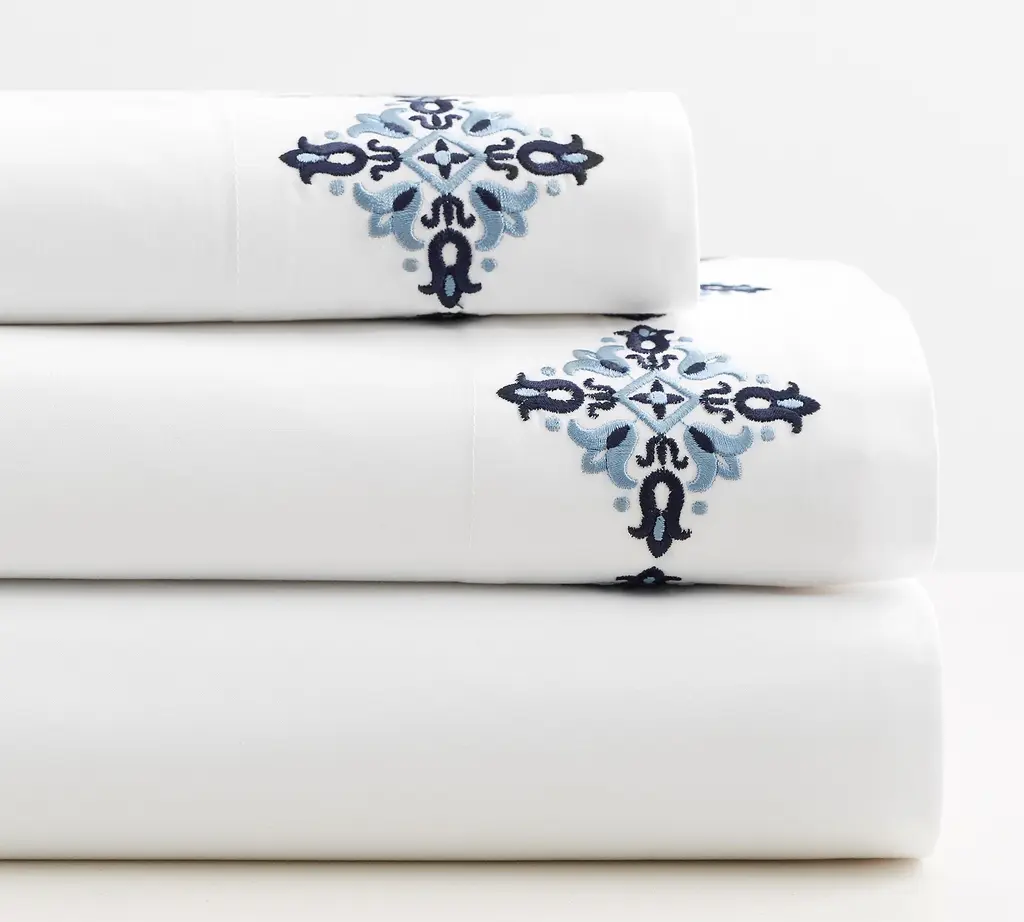 A finely embroidered motif accents our bright-white Tile Organic Bedding, bringing a pop of color and pattern to the bed. Available in a choice of stylish hues, it’s a perfect choice for mixing and matching.