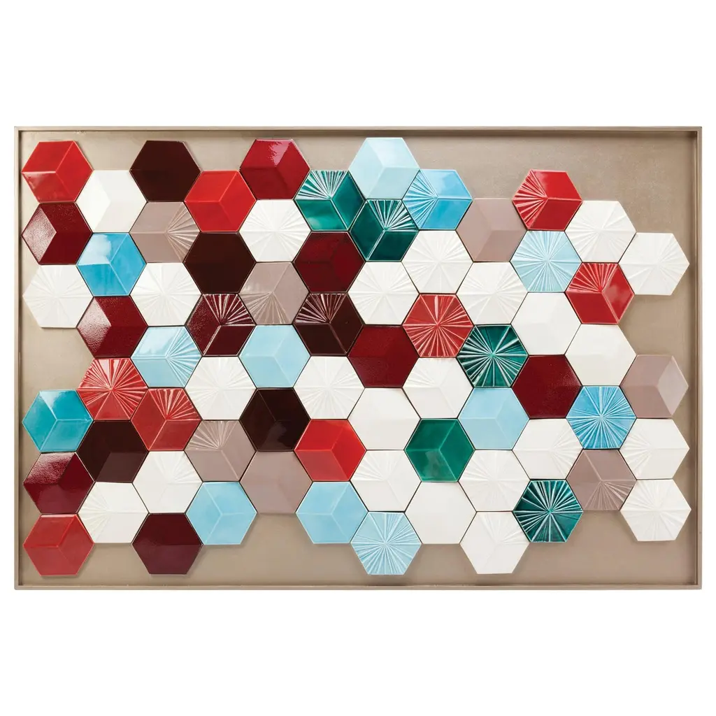 This handmade decorative tile panel combines the traditional Portuguese faience tile making techniques with a modern approach of shapes and color, resulting in a very visually impacting piece, which will bring life to any wall and for sure never going out of style. Made to Order. For sales with delivery address within European territories, VAT will be charged additionally to the stated price.