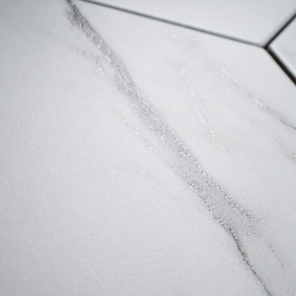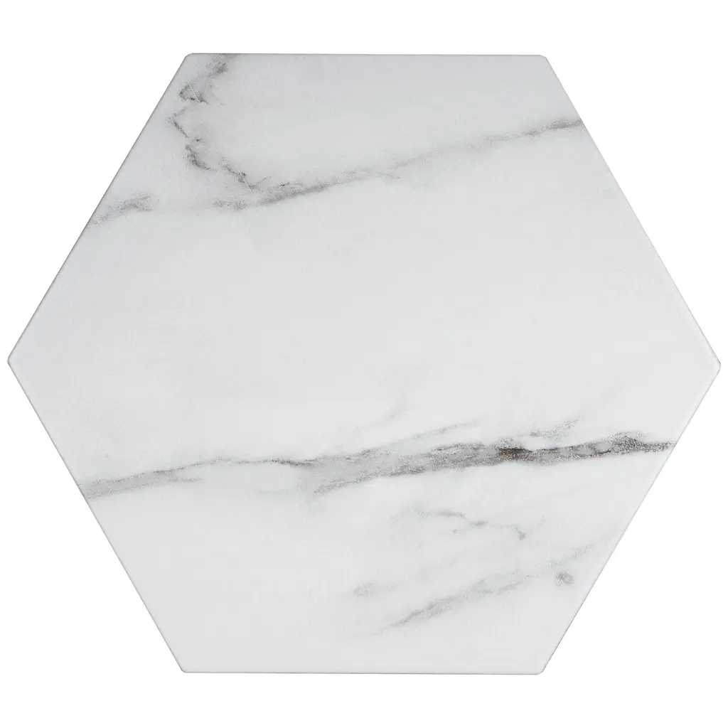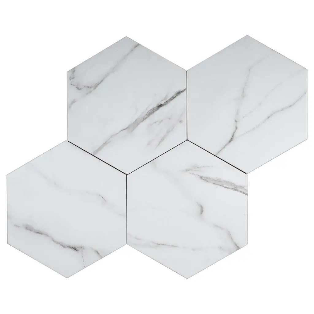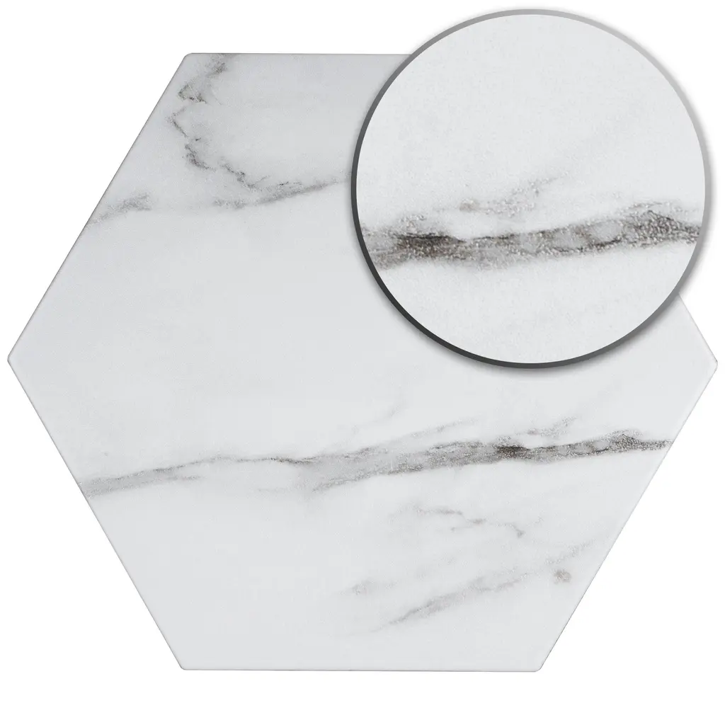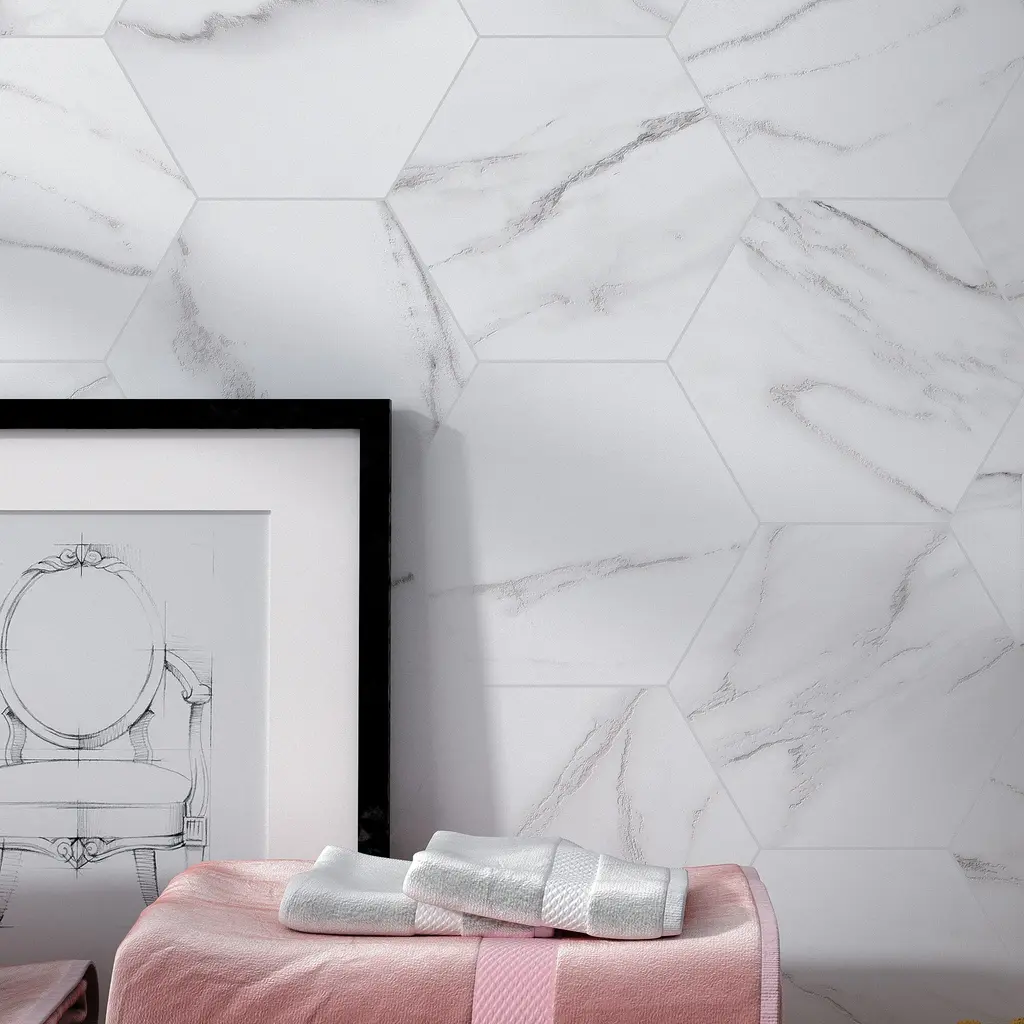 Tile Generation Calacatta White 8" x 9" Porcelain Marble Look Wall & Floor Tile features matte marble look design. High-quality Porcelain transforms your home into a magnificent space. The hexagon design creates beautiful layouts and designs when mixed and matched with other colors. It also features Low-maintenance and easy clean will make your life so much easier. This premium tile is an ideal and elegant look for your living room, kitchen, and bathroom.Details
