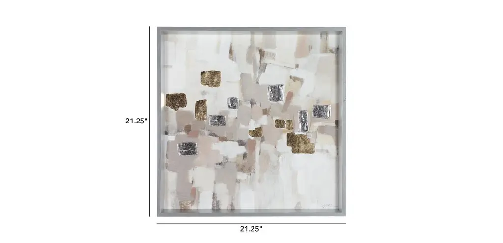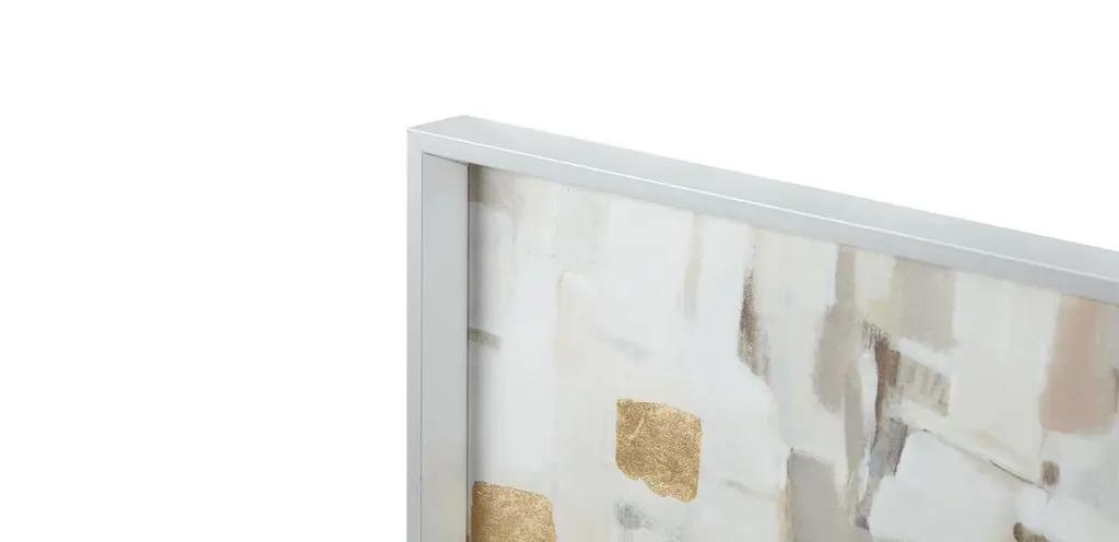 Like a view of the city through fog and rain-speckled glass. A neutral palette draws the eye in—you can almost make out the buildings in the distance—while speckles of gold and silver leaf evoke distant twinkling lights along the skyline.