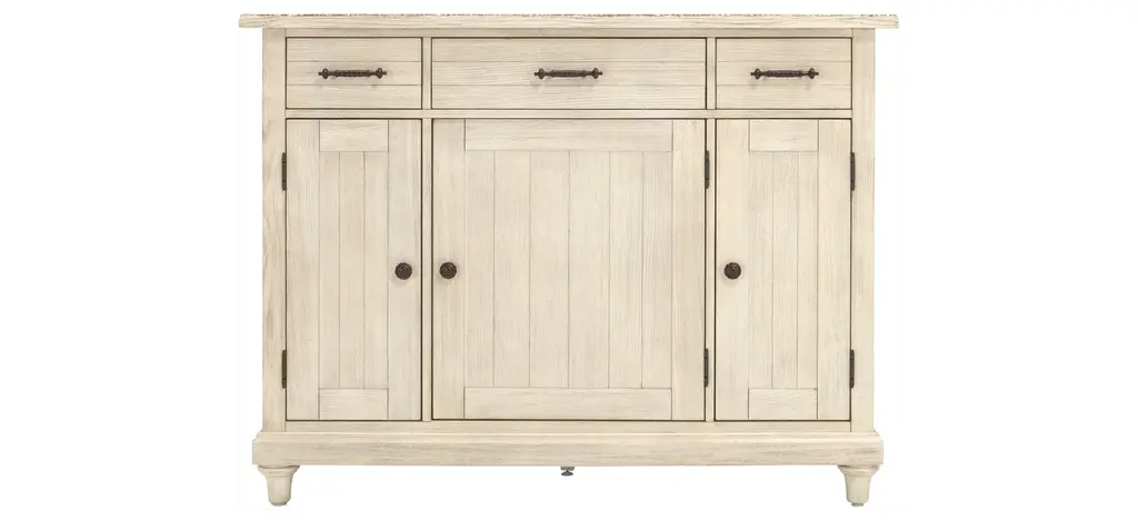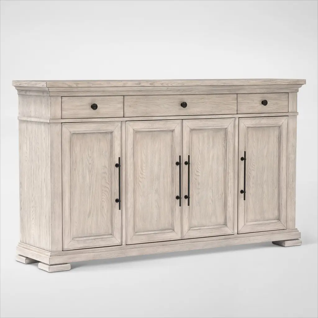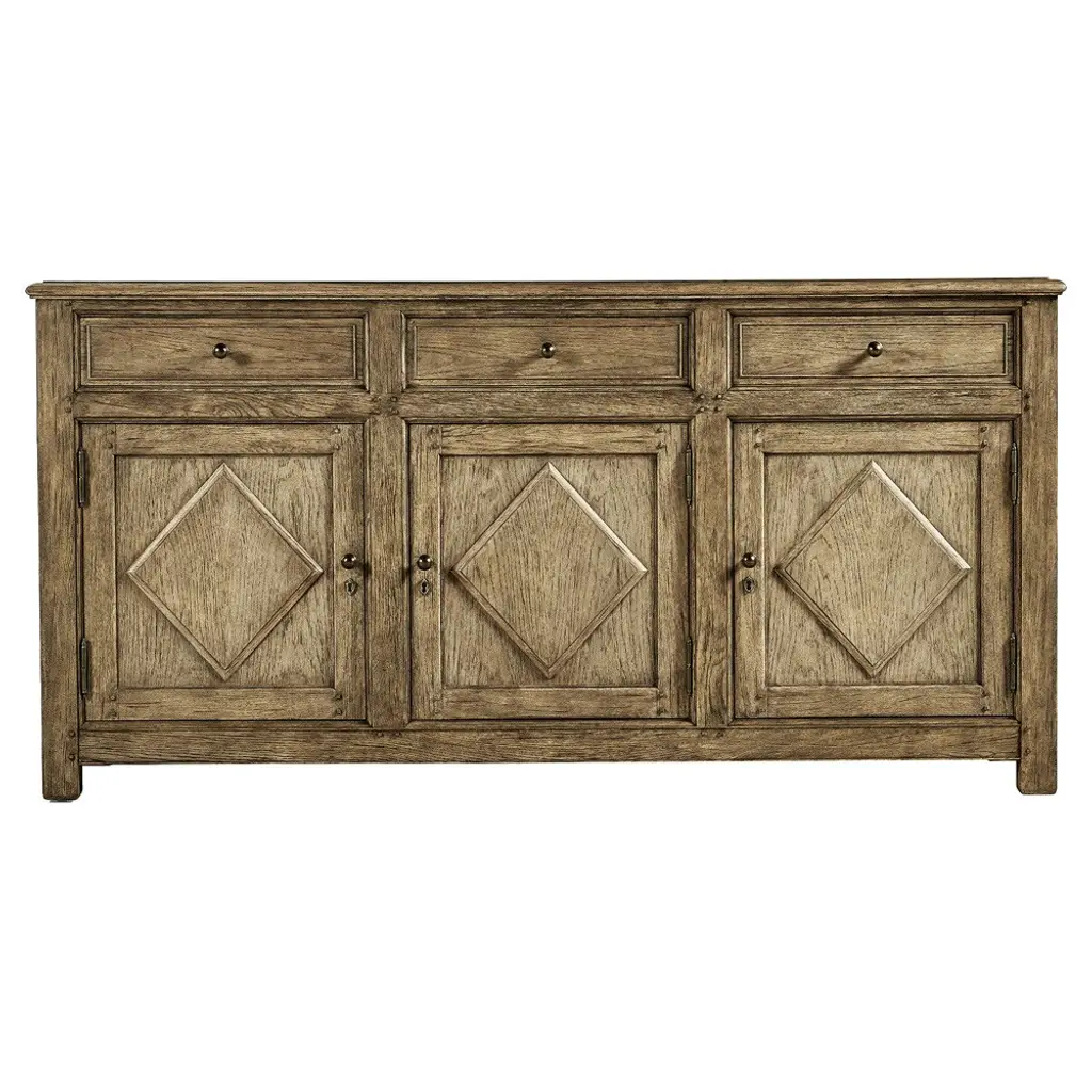 003-3-160-WNC The handsome Eon Rustic French Server by Jonathan Charles is the créme de la créme of credenzas. Brilliant furniture craftsmanship combines with luxury design through structural perfection of a Solid Oak frame with Chestnut veneers finished in an alluring Stripped Brown for an authentic and warm aesthetic. Outfitted with custom cast hardware, three pull out drawers sit over decorative panel doors that open to interior shelving providing enhanced storage for dining or living spaces.