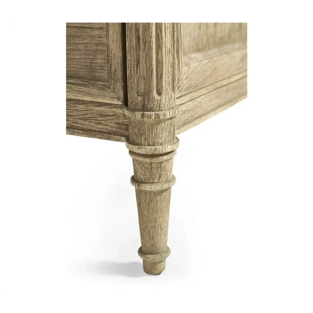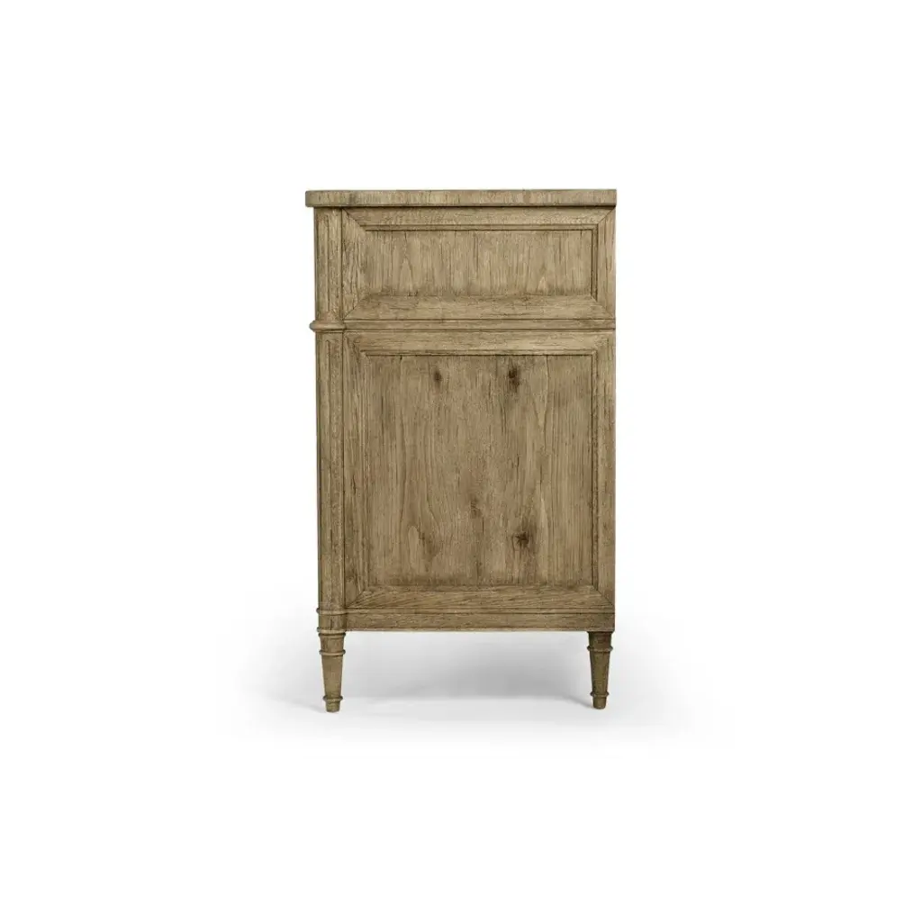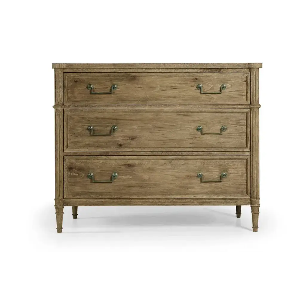 003-3-262-WNC (42") Inspired by the height of French refinement, the Kalpa chest from Jonathan Charles embodies timeless elegance with a stoic form accented by classic details. Wormy Chestnut in a natural stripped finish marries effortlessly with custom-cast hardware and lockable drawers for a versatile piece that elevates sophisticated interiors.