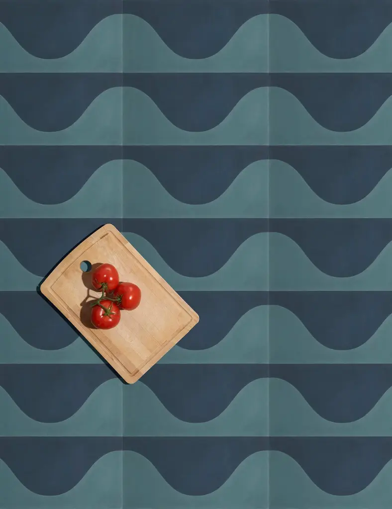 A wavy modular retro pattern that can be mixed and matched to create a dual-color or ombré pattern. Cement tilesType: Encaustic cement tileProduction process: Hydraulic pressing processMaterials: White cement, stone powder, additives, grey cement, sand/clay, and glazeQualities and maintenance: Porous — apply sealer as recommended by manufacturer on productTiles per box: 8 Note: Please expect subtle variations in the color and thickness of our handmade tiles. Lead times may vary and delays are possible due to circumstances beyond our control. We are not responsible for delayed installation, lost work time, or altered construction timelines in the event of a delay. All tile orders are final — no returns or exchanges will be accepted. Shorter lead times depend on stock availability.Samples are only for reference to color and scale, and although they are carefully packed, samples may be inadvertently damaged during shipment or may contain fragments of chipped tile or clear breaks in the sample. We add 20% overage to all tile orders to account for this.