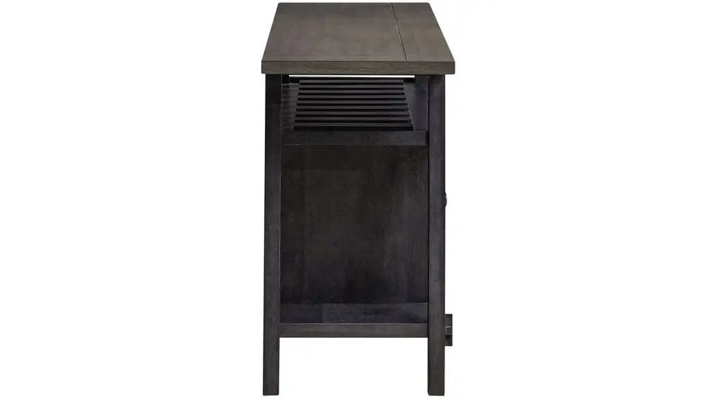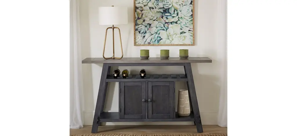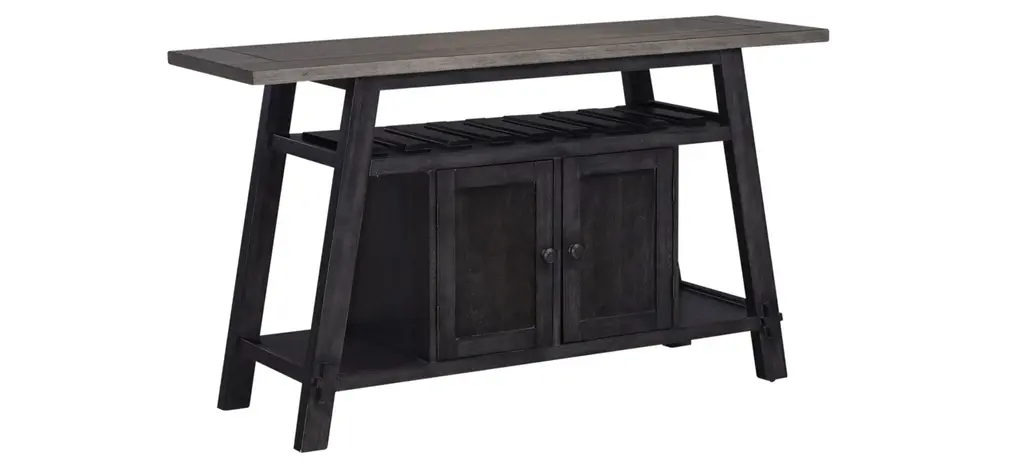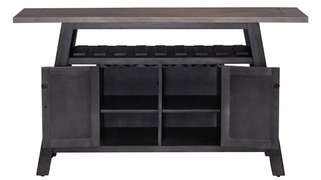 Indulge in transitional styling with the Timothy Server. Crafted of rubberwood solids and veneers, this piece features center doors for storage, wine storage that can hold up to eight bottles, side shelf display, and one adjustable shelf hidden behind the doors. The slate and weathered gray finish creates a look that is sure to pair beautifully with any d_cor in your home.