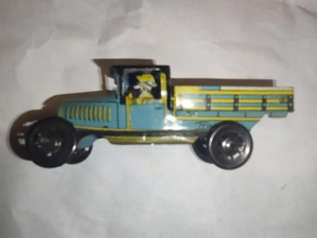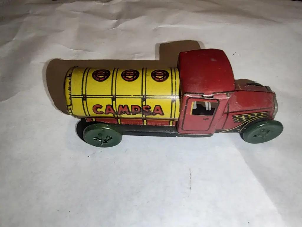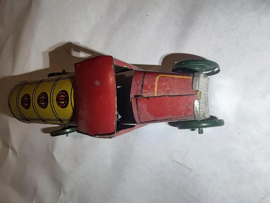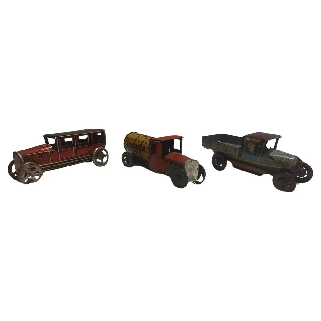 3 fabulous tin Litho Penny Toys vehicles. A stake truck, a tanker truck and a sedan car. All in excellent vintage condition with minimal wear.