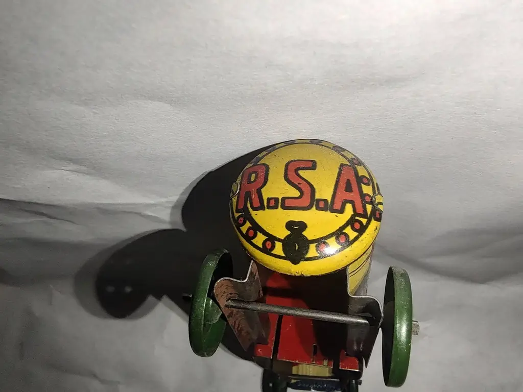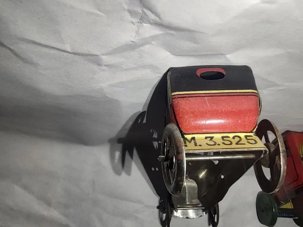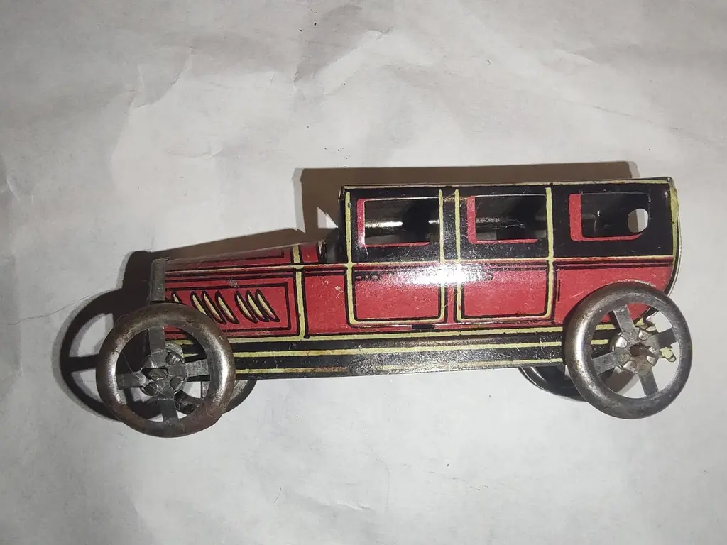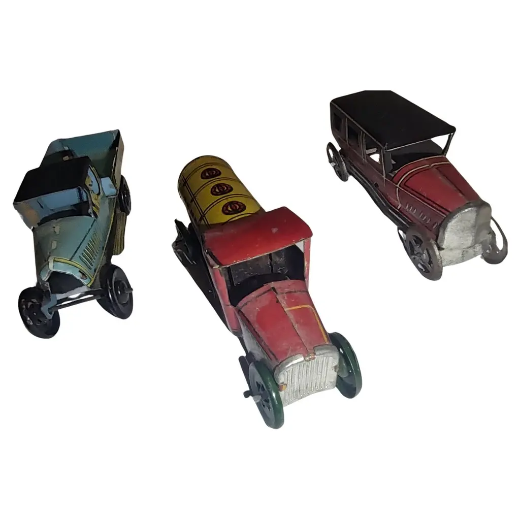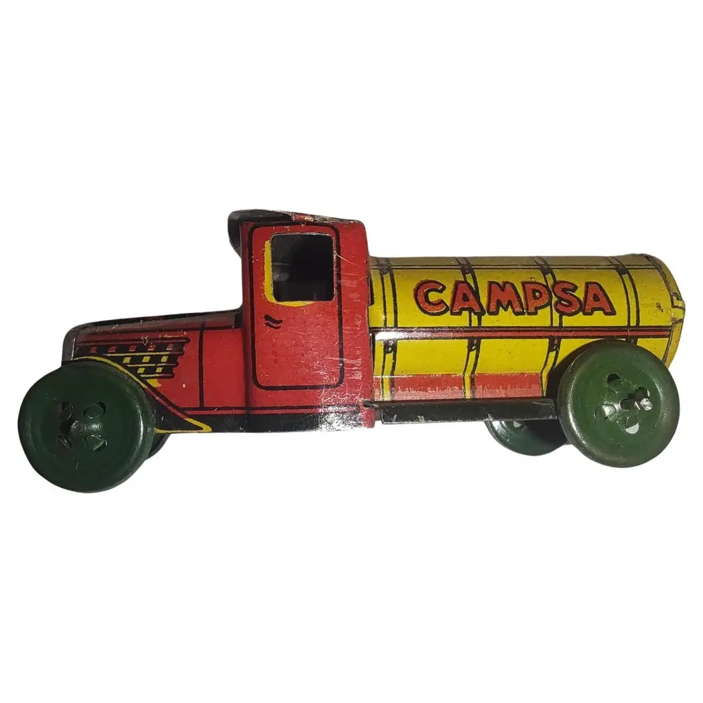 3 fabulous tin Litho Penny Toys vehicles. A stake truck, a tanker truck and a sedan car. All in excellent vintage condition with minimal wear.