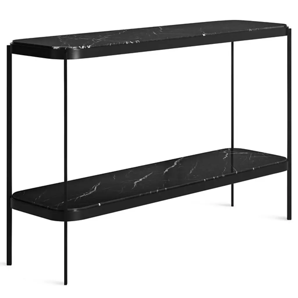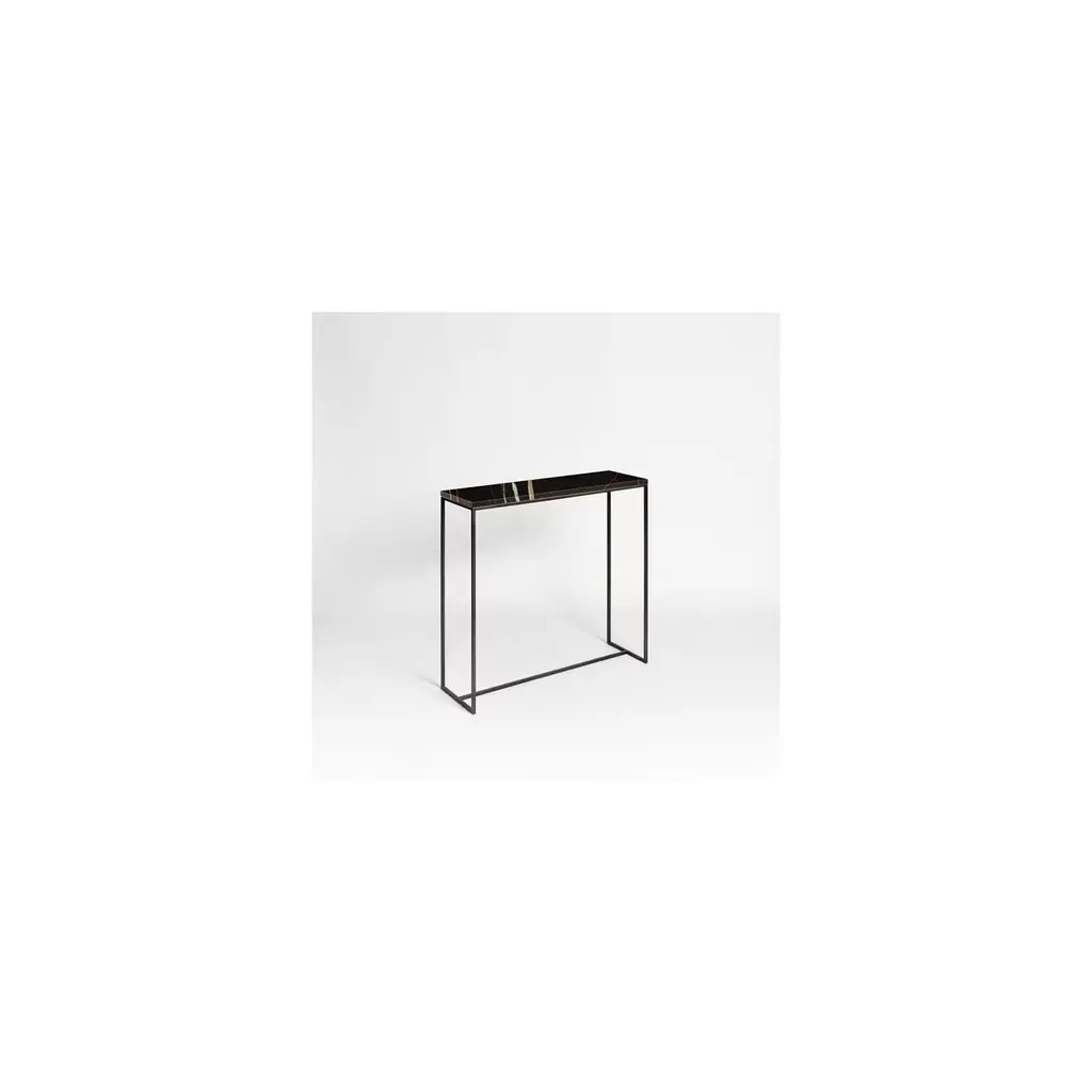 A striking statement piece for a contemporary entryway, this refined console is marked by clean and delicate lines juxtaposed to a stunning and thick Sahara Noir marble top. Fashioned of black-lacquered iron, the base is available in a gold or gray finish that will equally match the mesmerizing top. Other marble types are also available upon request.