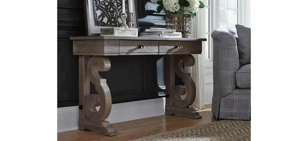 Bring Old World charm home with the Tinley Park rectangular sofa table. Gracious S-curved carved bases support overlaid solid pine tops finished in vintage inspired dovetail gray pine. Weathered Bronze metal stretchers and hardware create the perfect accent to set the mood for stunning European influenced elegance.