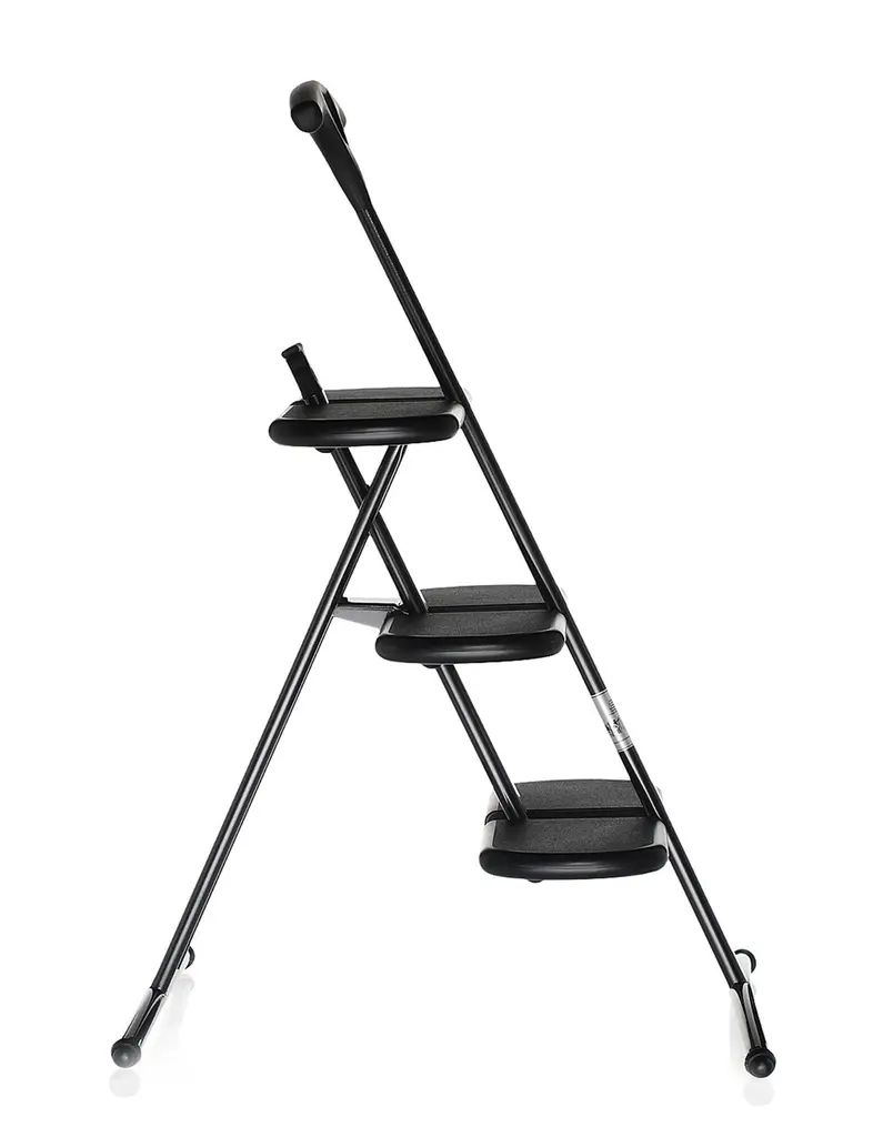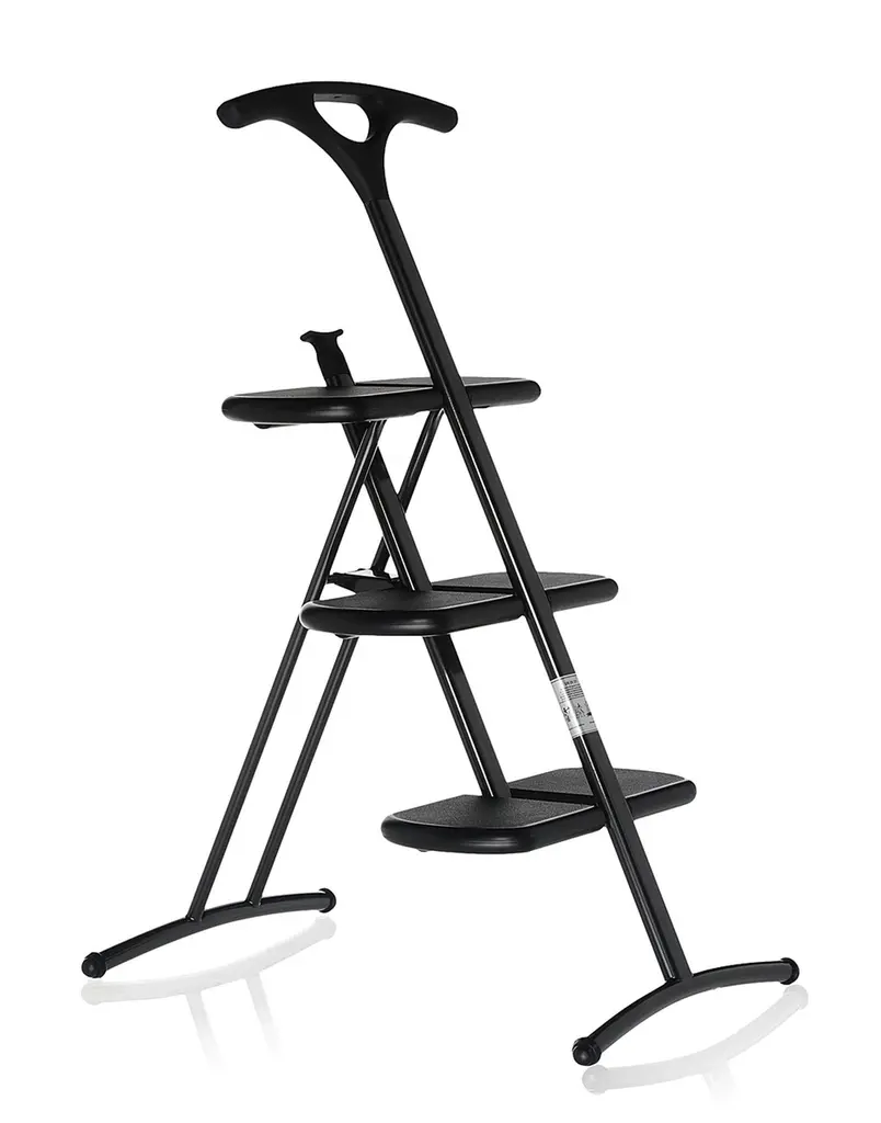 This is a functional 3-foot folding stepladder with slip-resistant finish. Tiramisù features a light supporting structural design: the curved bars offer support on the ground and the handle constitutes not only a robust support feature during use, but also a practical functional tool after use. Thanks to its design it is possible to mount Tiramisù on the wall.