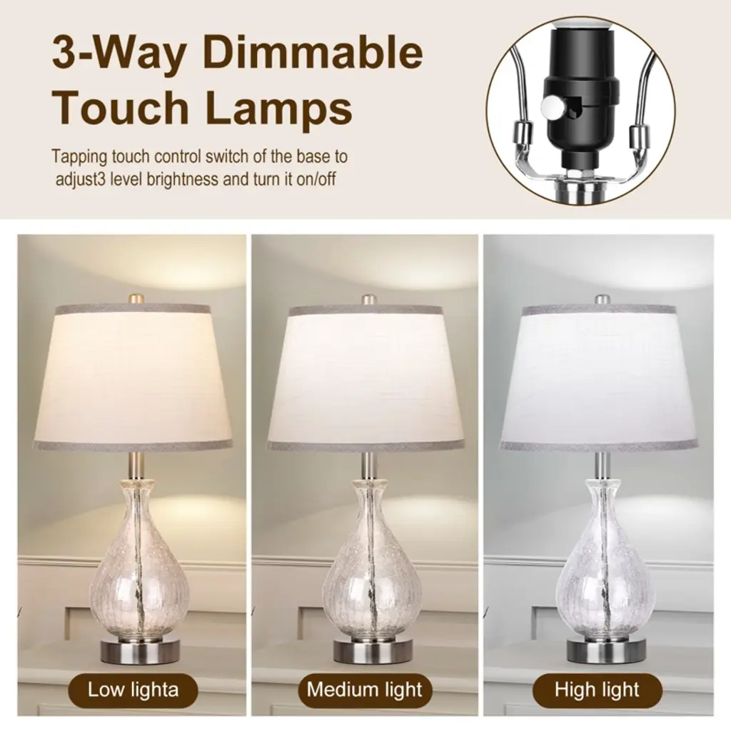 Tiramisubest Glass Table Lamp Set Of 2 Touch Control 3 Way Dimmable White Ice Crackle Glass White Fabric Shade Modern Bedside Bedroom, White