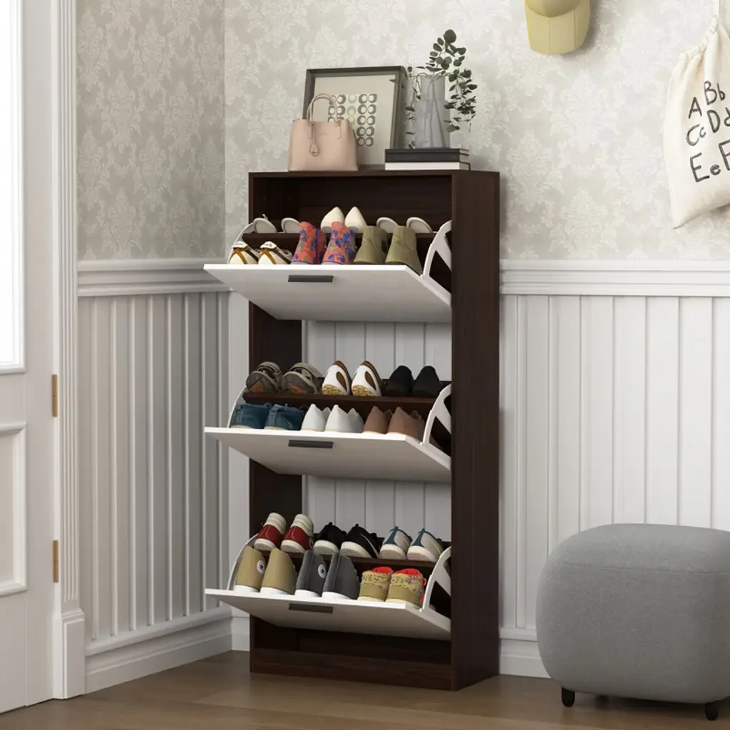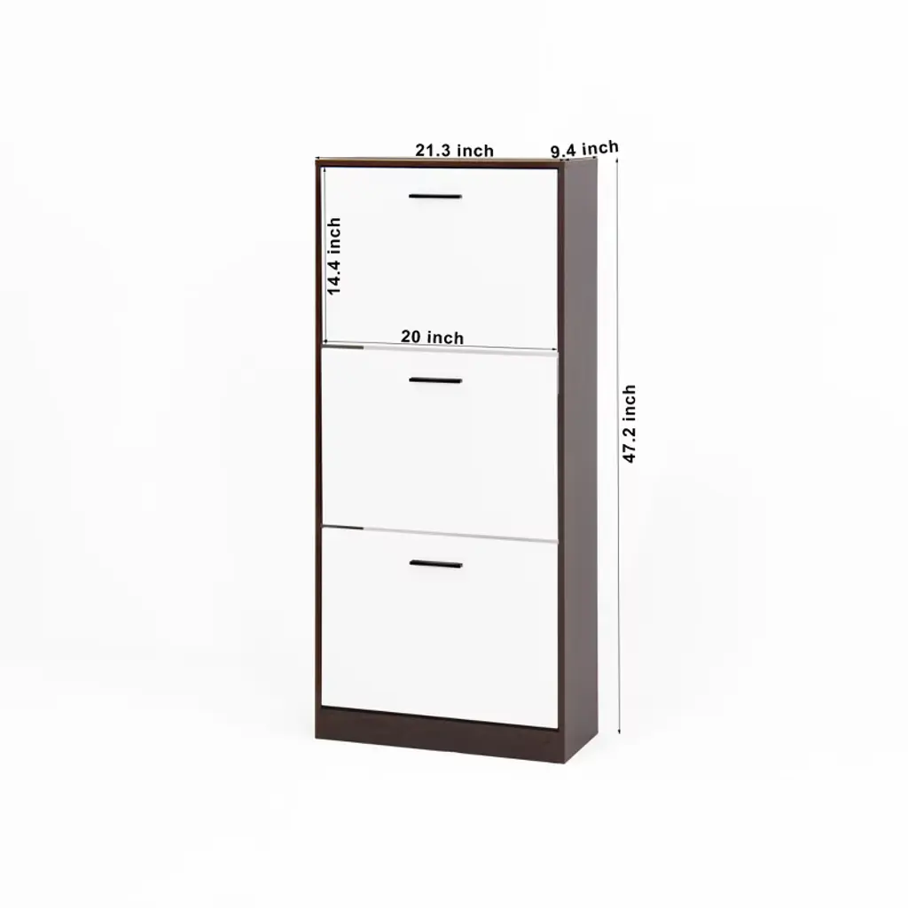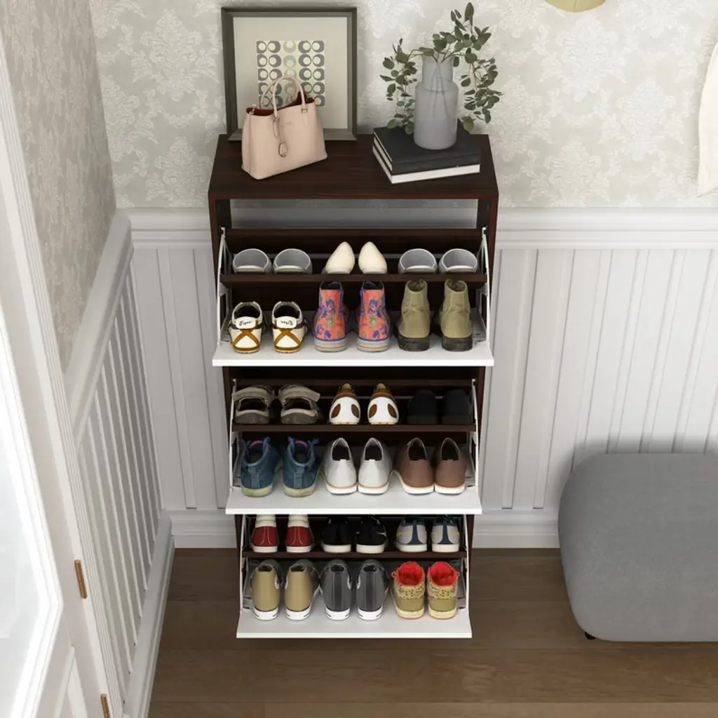 The White & Walnut Shoe Cabinet combines farmhouse charm with smart storage, featuring 3 flip-down drawers (18-pair capacity) in a space-saving narrow design. The adjustable shelves accommodate boots to flats, while anti-tip wall mounts ensure child/pet safety. Crafted from durable particle board with elegant wood handles, this versatile organizer enhances entryways, hallways, or porches with its clean two-tone aesthetic.