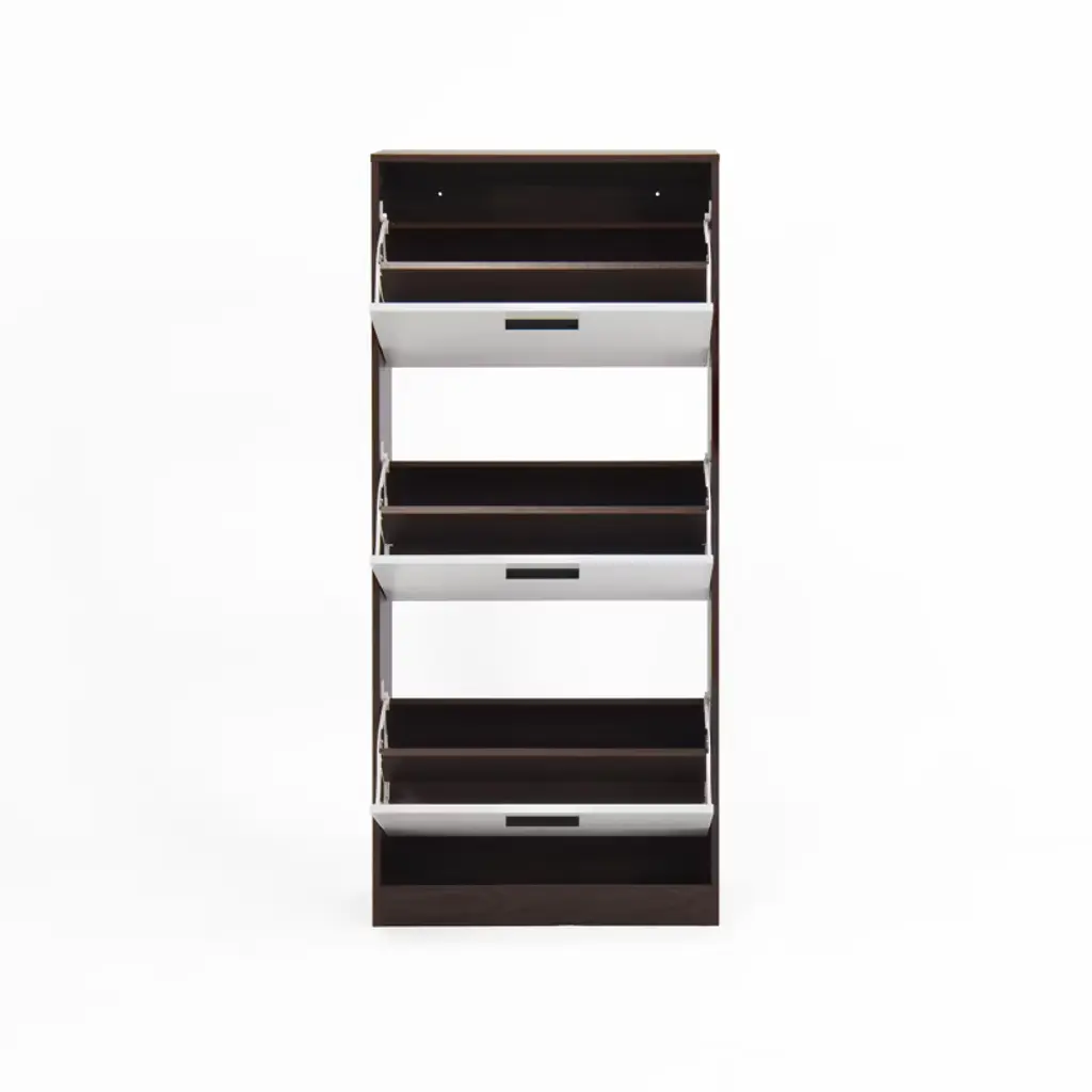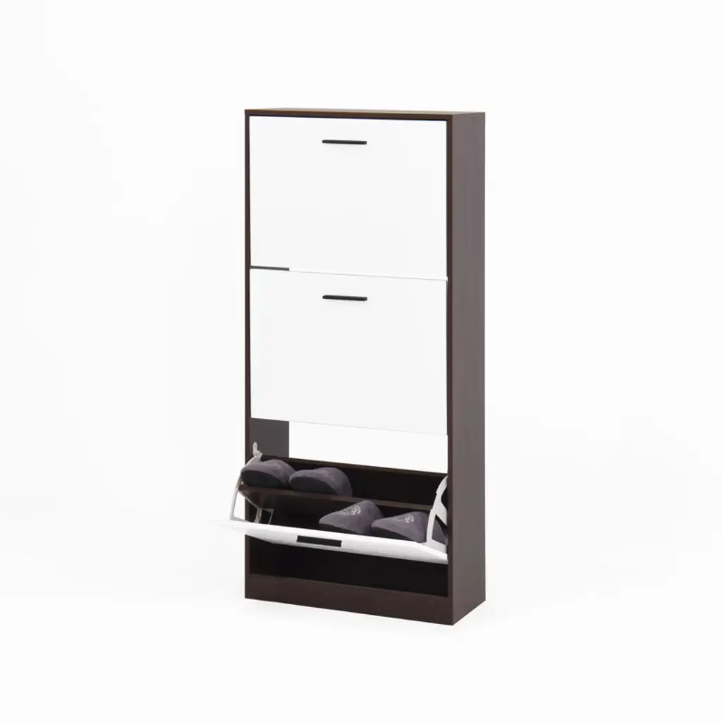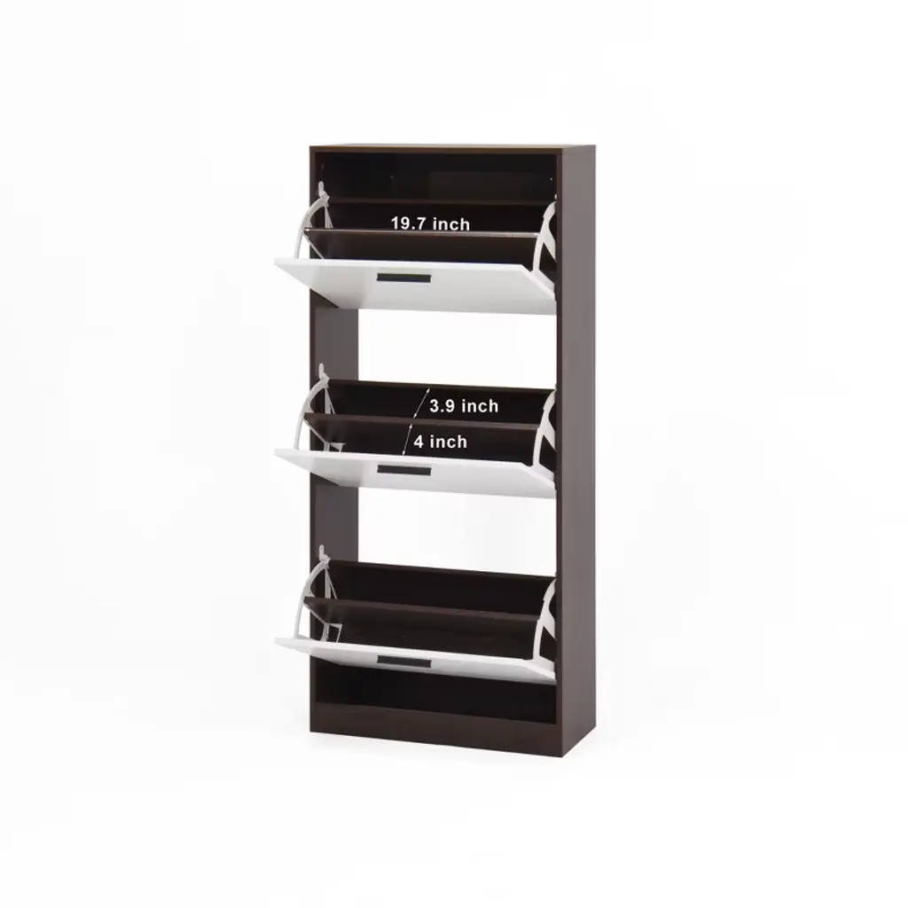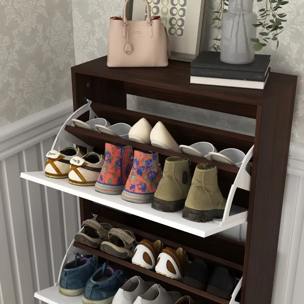 The White & Walnut Shoe Cabinet combines farmhouse charm with smart storage, featuring 3 flip-down drawers (18-pair capacity) in a space-saving narrow design. The adjustable shelves accommodate boots to flats, while anti-tip wall mounts ensure child/pet safety. Crafted from durable particle board with elegant wood handles, this versatile organizer enhances entryways, hallways, or porches with its clean two-tone aesthetic.