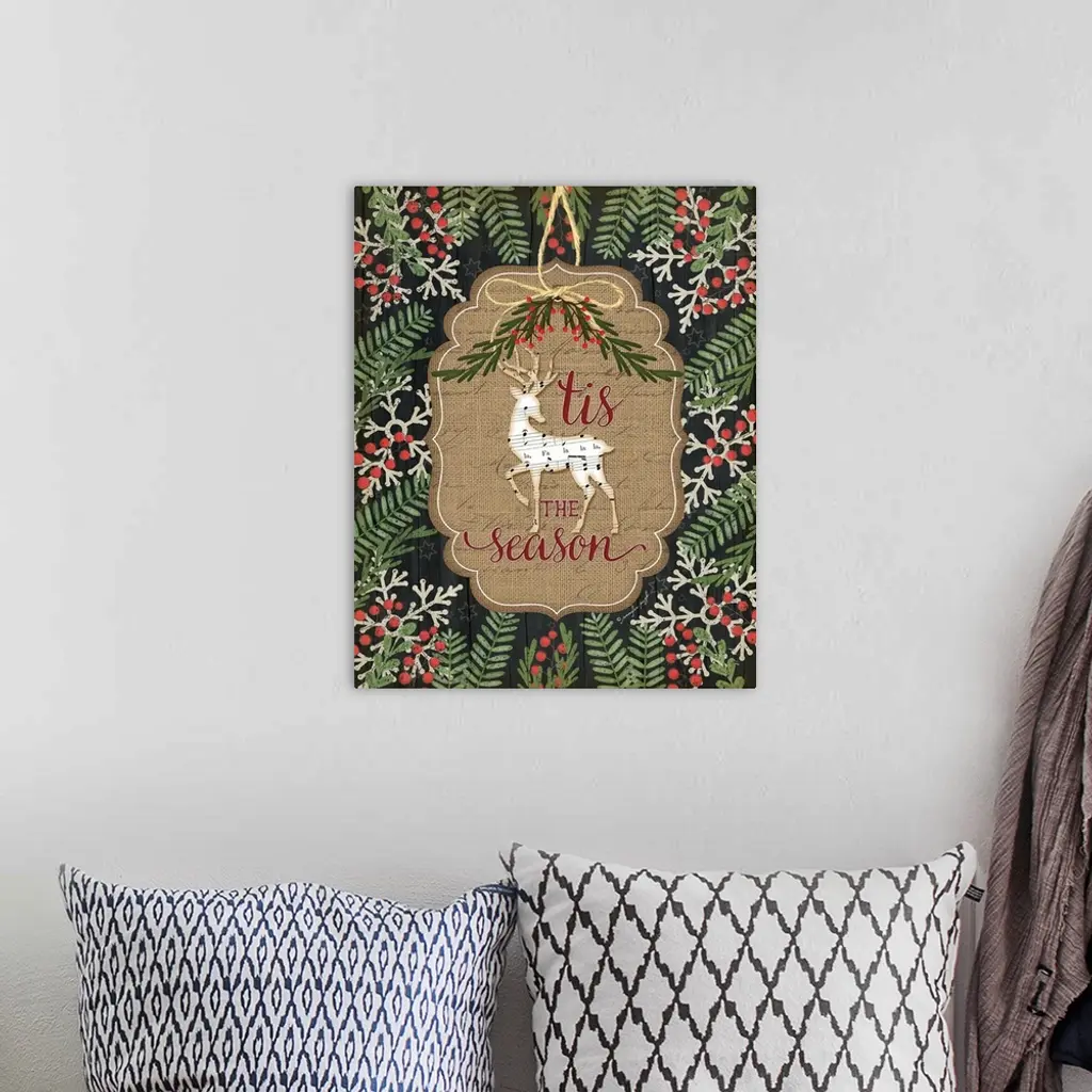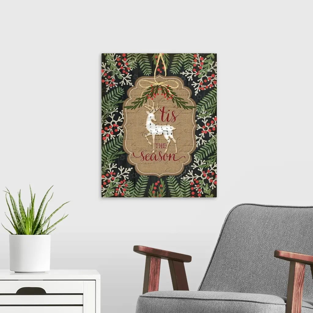 Christmas decor featuring a deer cut out of sheets of music and the words, "'Tis the season" .