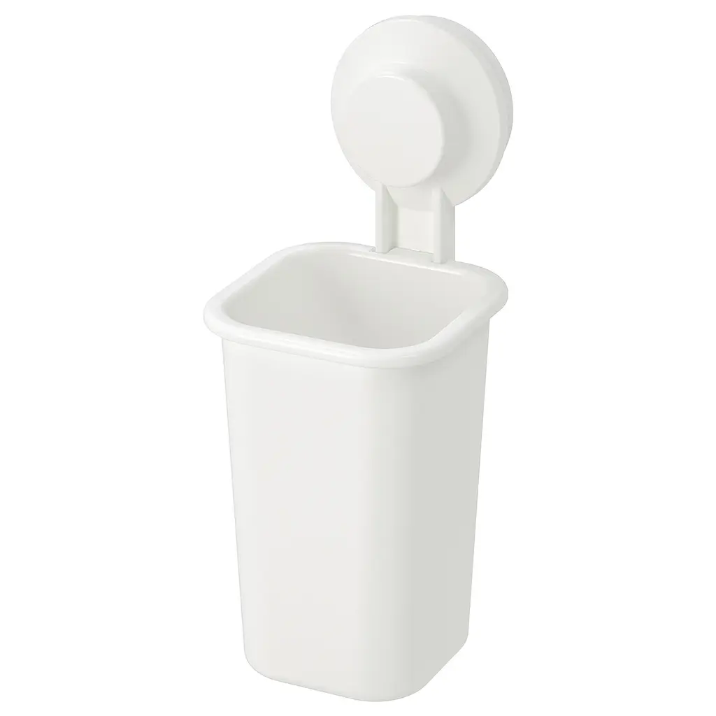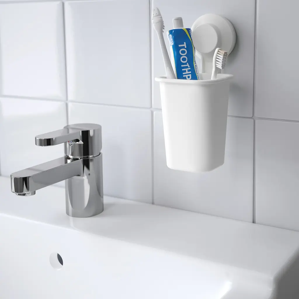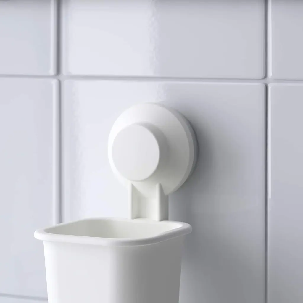 TISKEN Toothbrush holder with suction cup - white. One push assembly - clean the wall surface and push to attach. No tools are needed. To release and remove, insert a credit card (or similar) between the suction cup and the wall. No ugly holes or marks are left behind. Holds up to 6 lbs.