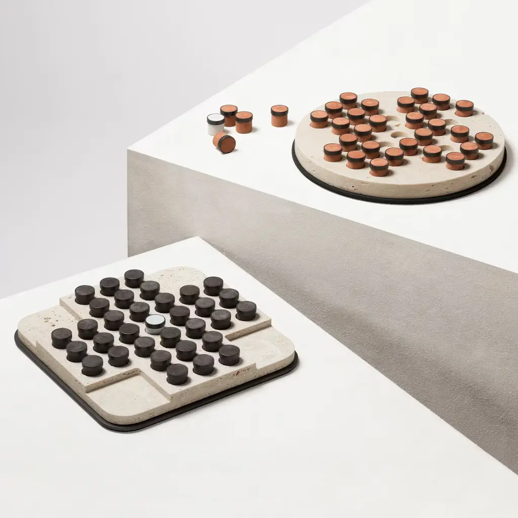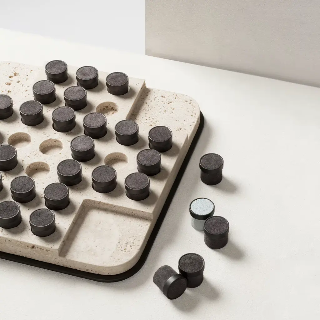 Marble playing field featuring a brushed bronze base. The set is equipped with pieces made of brushed bronze with leather inserts. Other marble finishes include arabescato white and travertino, please ask the Concierge for details.