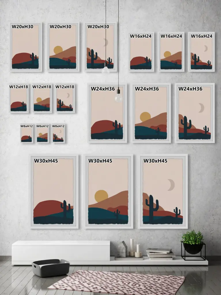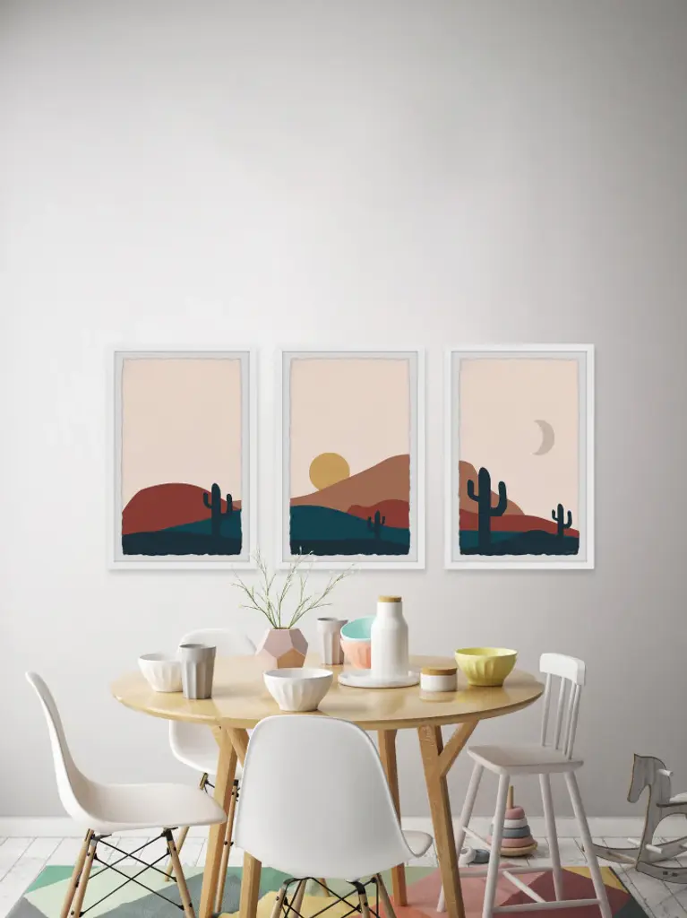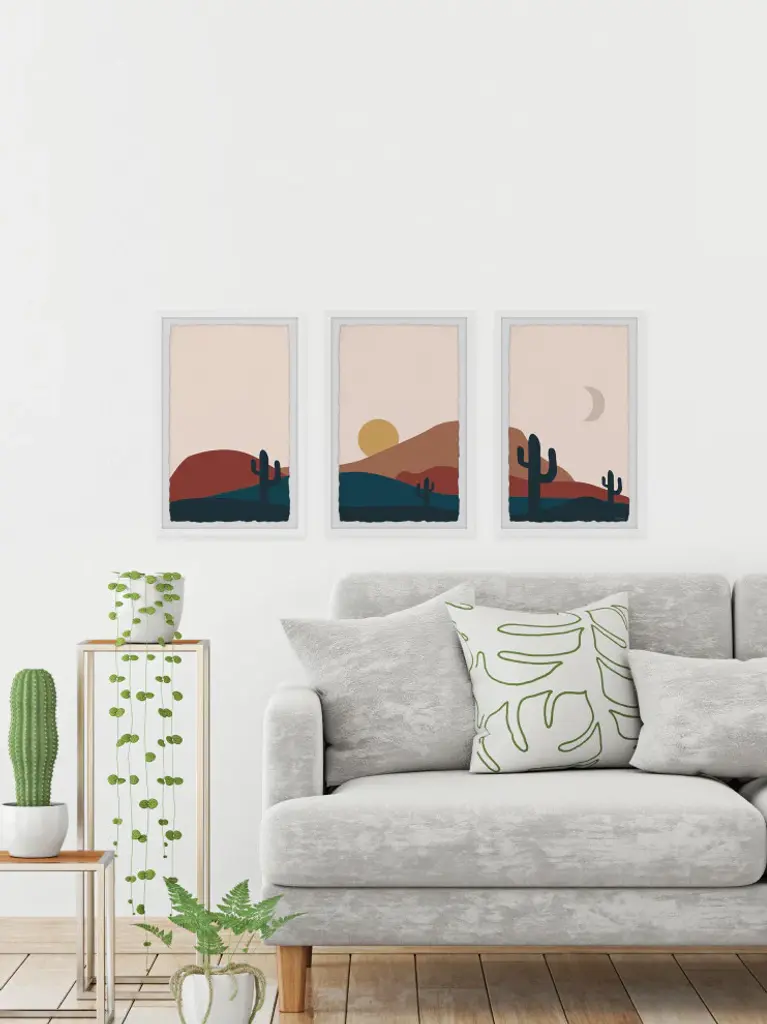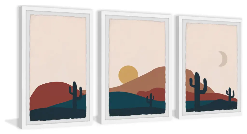 These three drawing prints come together to create a stunning desert scene of overlapping mountains and cacti. Proudly printed in the USA, this piece is printed on high quality archive paper and professionally hand-framed. With wall-mounting hooks included, this artful accent is ready to hang up as soon as it reaches your front door.- (3) panels of 16x24- Top quality Giclee print on high resolution Archive Paper- Hand cut deckled edges- High quality durable non-warping frame- Finished under shatter resistant plexiglass- Arrives ready to hang- Includes a certificate of authenticity- Printed in the USA
