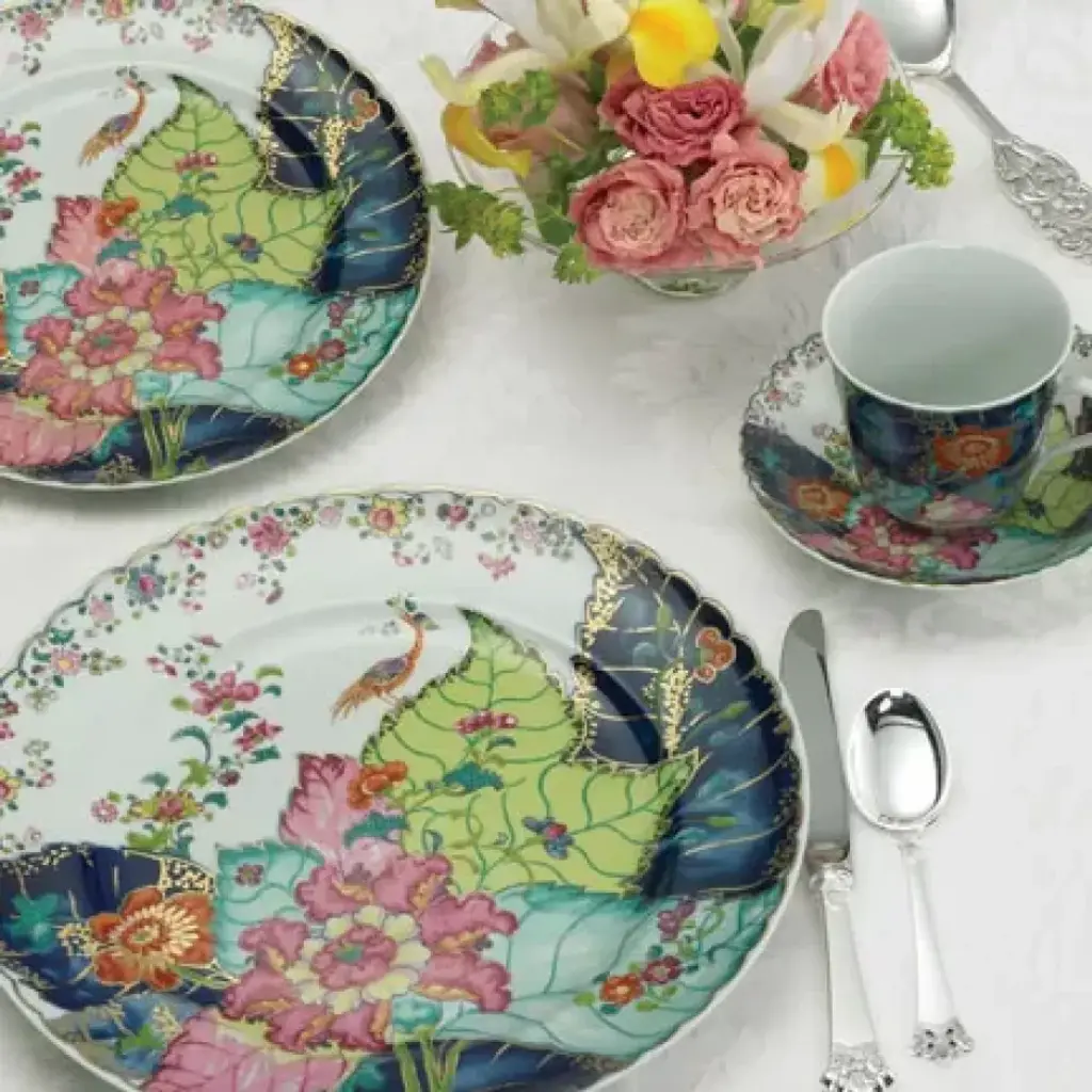 The large round Tobacco Leaf cachepot is an elegant container for plants and is a statement decorative accessory. A favorite with brides, Mottahedeh specializes in luxurious patterns and unique, elegant shapes that are reproduced from china found in museums and historical societies. The patterns feature complex and vibrant colors, and hand-painted gold decoration. The pieces are surprisingly fresh and timely, and look wonderful in both contemporary and traditional dining rooms.