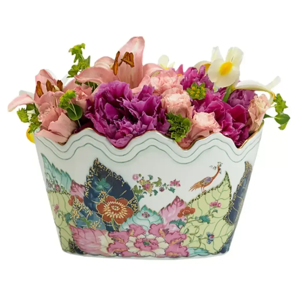 The small Tobacco Leaf cachepot is suitable for a single plant or flowers and is a lovely accent piece. A favorite with brides, Mottahedeh specializes in luxurious patterns and unique, elegant shapes that are reproduced from china found in museums and historical societies. The patterns feature complex and vibrant colors, and hand-painted gold decoration. The pieces are surprisingly fresh and timely, and look wonderful in both contemporary and traditional dining rooms.