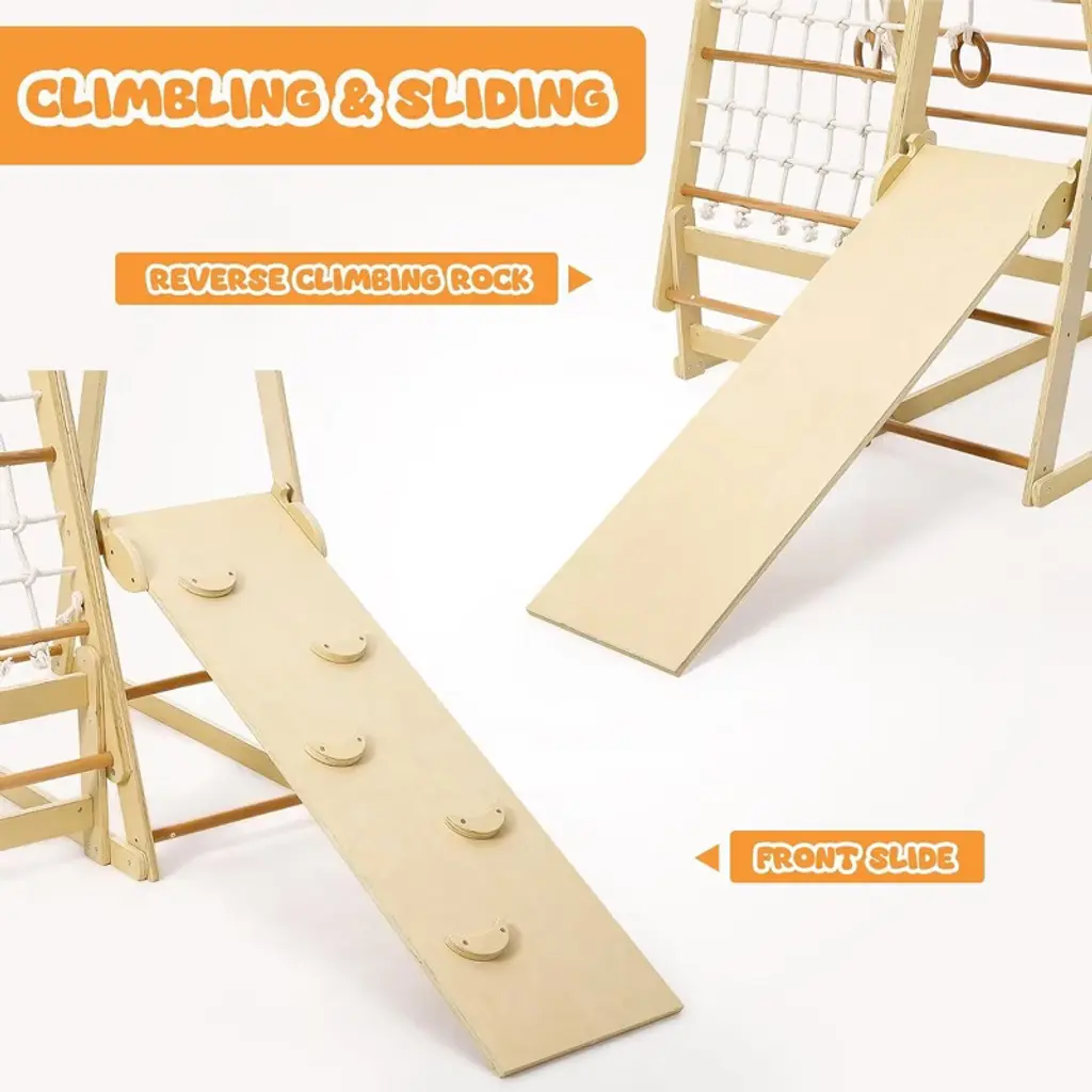 "Child indoor fitness toy set is made of natural wood, safe, environmentally friendly and non-toxic. Kids climbing frame adopts a round edge design to ensure the safety of the child. 7-in-1 climbing toy includes rings, ladders, slides and many other play options. Wooden climbing toys can be used alone or together to save space."