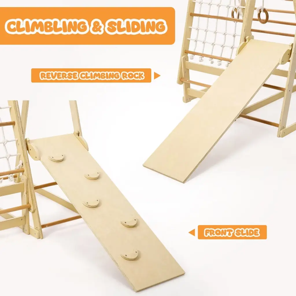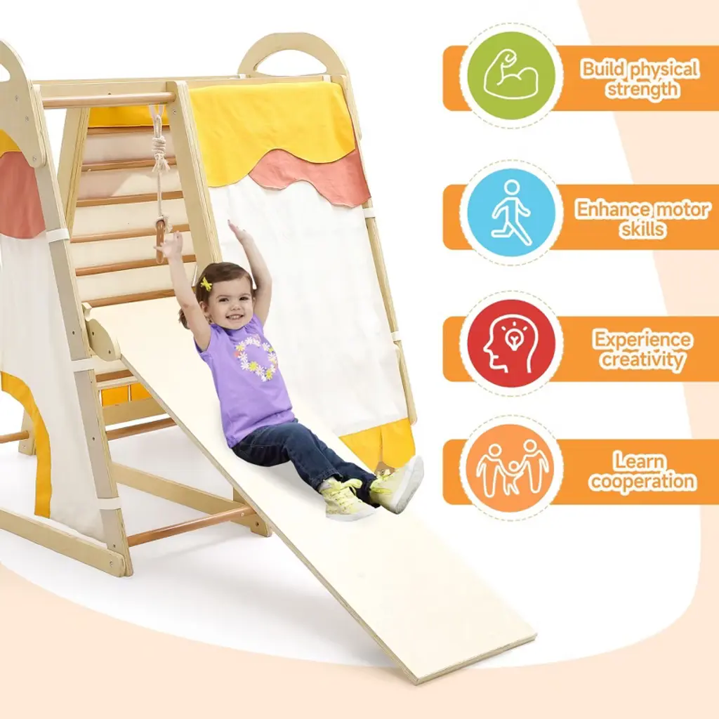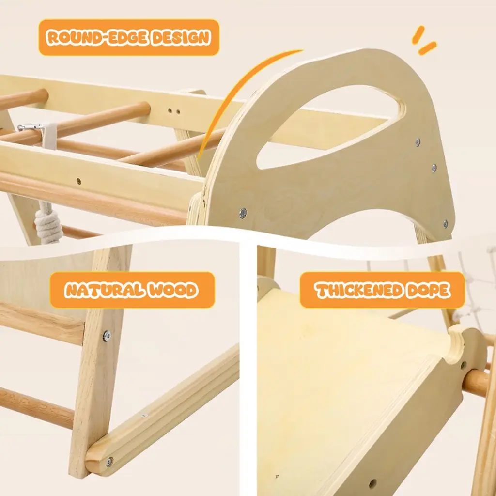 Crafted from natural wood with smooth, rounded edges and painted with odorless, child-safe paint, this toddler indoor climbing set ensures a secure play environment. Certified to meet safety standards, it offers parents peace of mind.