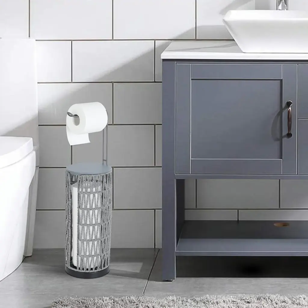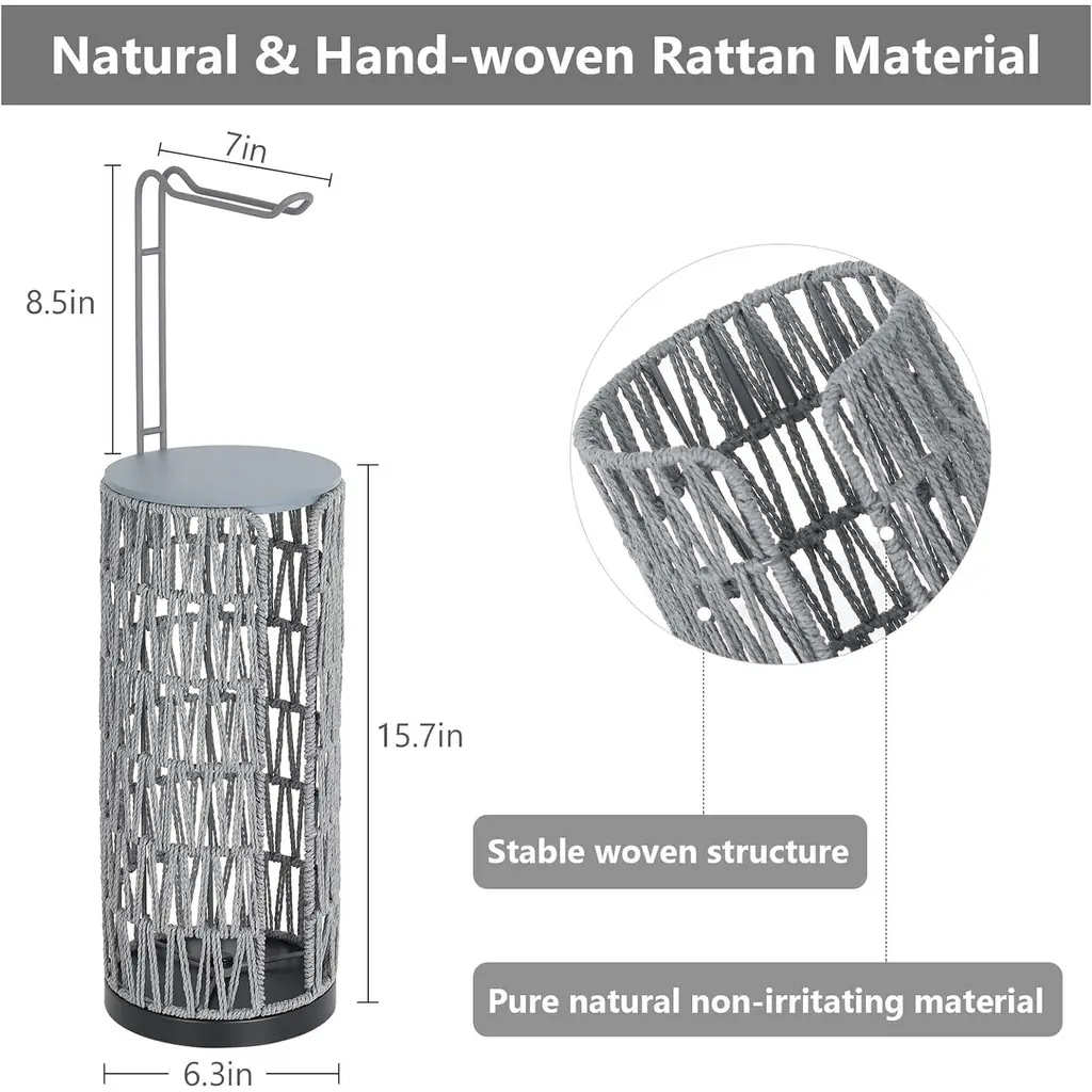 Warm tips: Product after-sales guide 🚀Thank you for purchasing our products!Please do not return the product in case of problems. Please take a photo and send it to us, we will quickly process and provide a reasonable solution. Thank you for your cooperation! 🙏【FUNCTIONAL TOILET PAPER STORAGE】:This toilet paper stand provides instant storage for 3 rolls of extra toilet paper,3 rolls on storage towel and 1 roll on the paper dispenser.Combined structure of toilet paper roll holder and paper dispenser makes grabbing a reserve roll of toilet tissue quick and easy; Tissue holder ideal for small spaces where storage is limited, it tucks neatly beside or behind the toilet seat【FREE STANDING DESIGN】This freestanding toilet paper holder is space saving and movable, the toilet paper holders with storage can be moved to a reachable place next to you and can be used in condos;Toilet paper holder stand perfect for bathrooms with no wall mount fixtures,Great for guest bathrooms, half baths, powder rooms, and smaller spaces where storage is limited,use the boho bathroom decor to create instant storage space.【NATURAL METERIAL】Farmhouse toilet tissue paper holder made of natural, eco-friendly rattan adds to any decor.Measures 6.3" diameter x 15.7" high,Our toilet paper holder with shelf has a special weight gain base which ensures the tissue holder for bathroom will not fall over easily,so rolls are always clean, dry, and ready to use【EASY TO ASSEMBLE】No tools or scres needed, simply connect the 3 parts: toilet paper basket, lid and roll storage holder. Save your time.toilet paper organizer features a lid to prevent dust.and the mid lid is a great bonus, which keeps your personal items like phone, wipes close to your hand. toilet paper stand holder also makes your bathroom cleaners, hand sanitizer accessible.