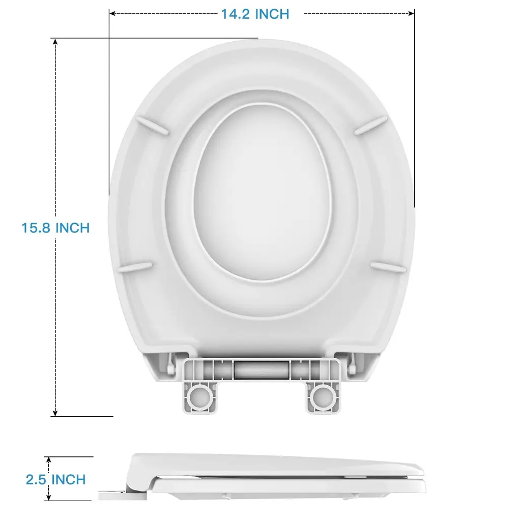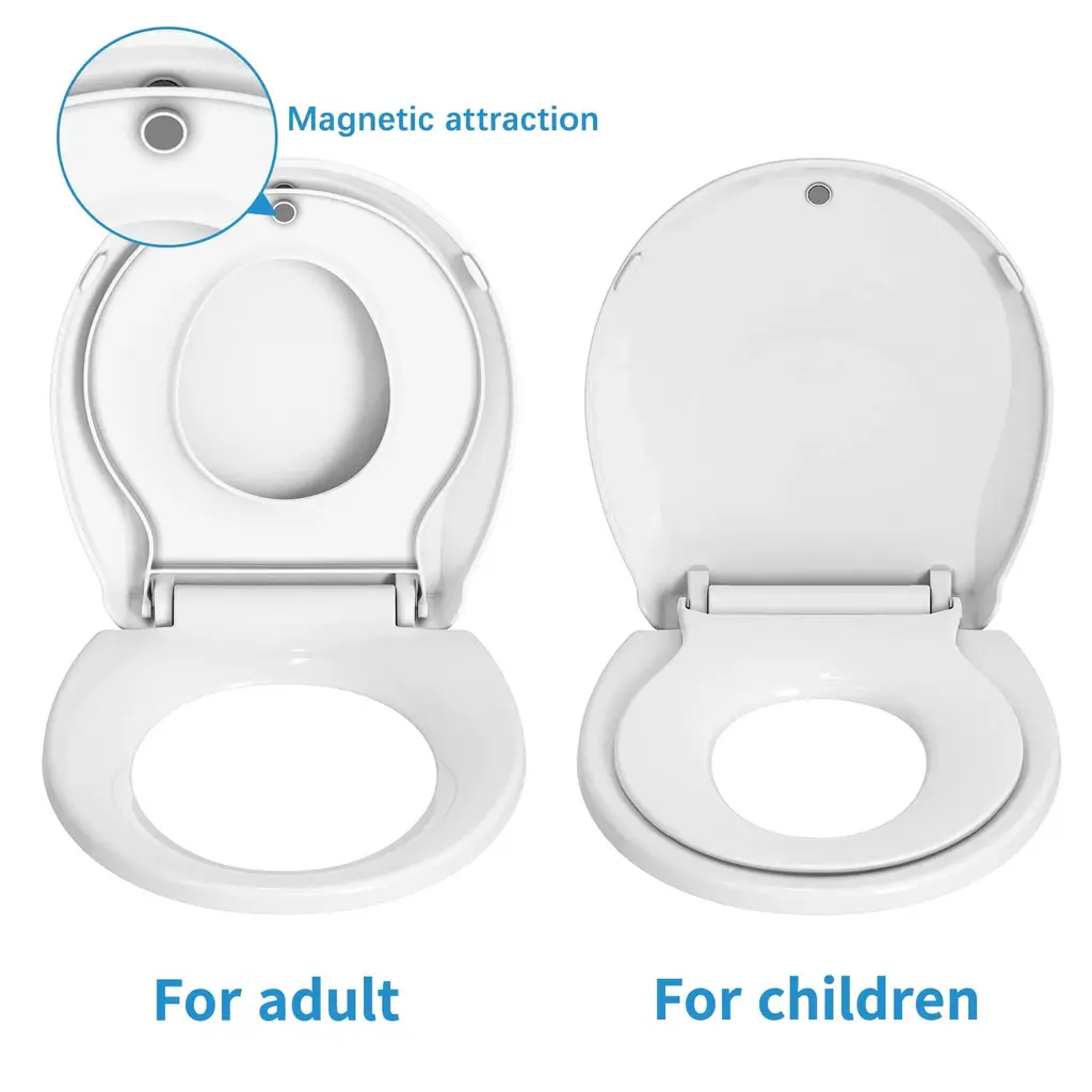 【Easy to Install&Clean】- The quick-detach design makes it quick and easy to install or remove; Screws required for installation are included in the package, in addition, we also offer two rubber pads to protect the hinge. After use, you can easily clean the toilet seat with a paper towel or rag.【Durable Thick Material】- This round toilet seat is made of high-quality thick polypropylene plastic, which is resistant to stains, chips, scratches, cracks on the surface; Compared with ordinary plastic and wood, it is stronger, durable, non-fading, and non-deformable.【Slow and Quite Close】- The toilet seat closes slowly and quietly, without slamming, can increases a quiet experience during sleeping time, also can ensure that the toilet seat is not impacted and extend the life of the toilet seat lid. Brings a quiet indoor environment for your family.【Size: Round】- This is an ROUND toilet seat. Standard Size Length:16.2-16.7 inch, Width:14.2 inch, the mounting hole distance 5.15-6.18 inche, it's suitable for most standard round toilet bowls; Please measure your toilet before ordering.【Fits Both Adult and Child】- This toilet seat with toddler seat built in, suitable adult and child seat ring size, meet all family members' need; Single Magnet designed for child toilet seat make child to pull down easily and improve children's independence on potty using.