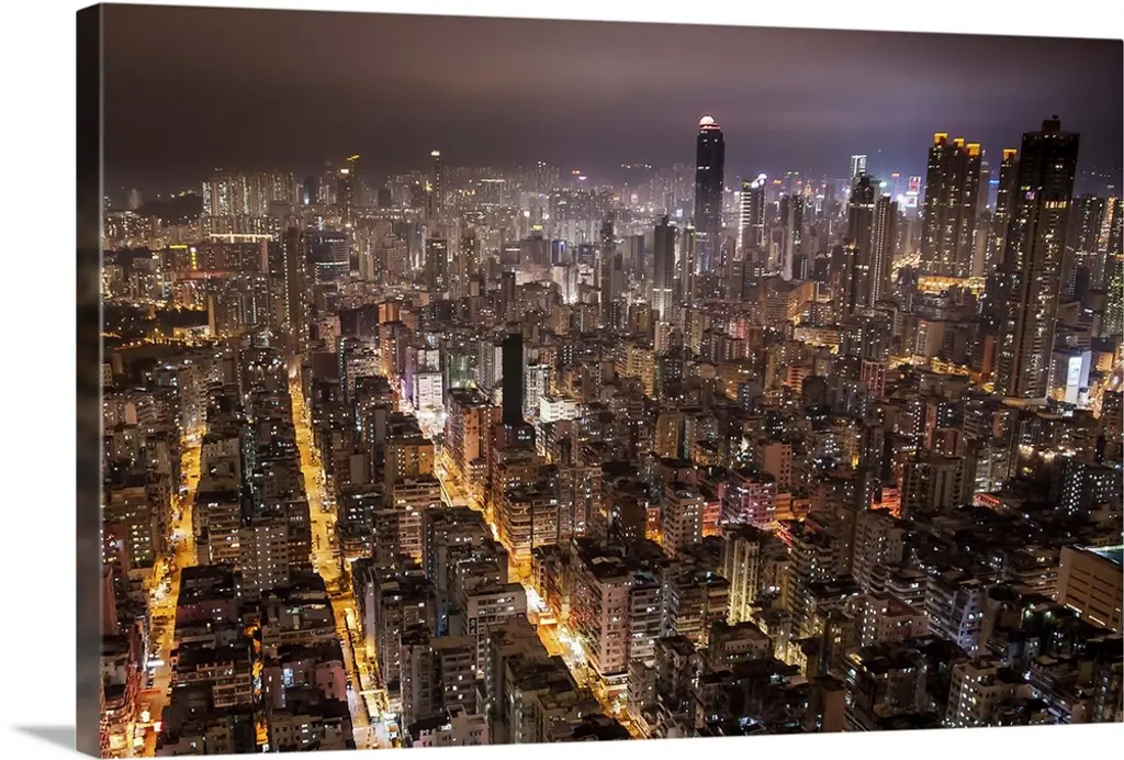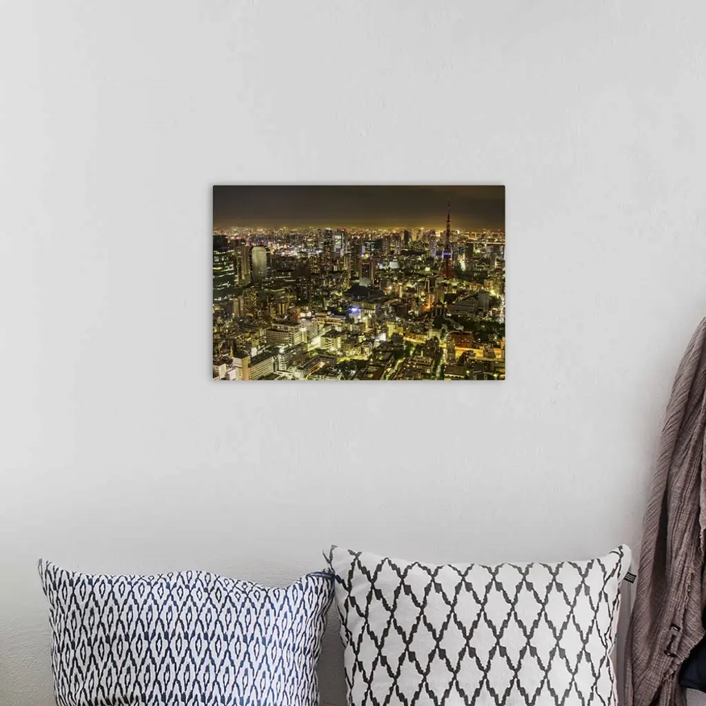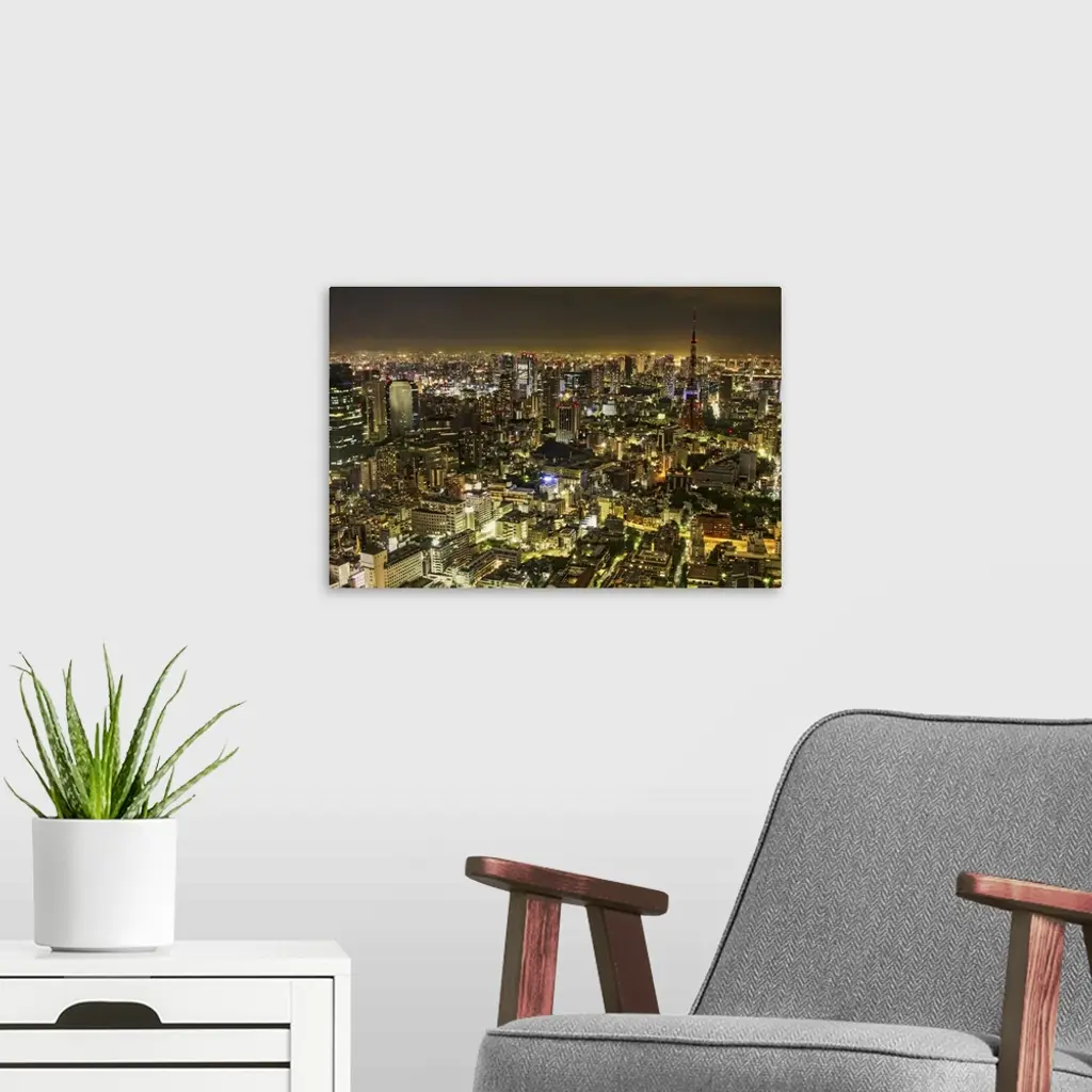 Horizontal, big aerial photograph of the city of Tokyo, brightly lit at night.