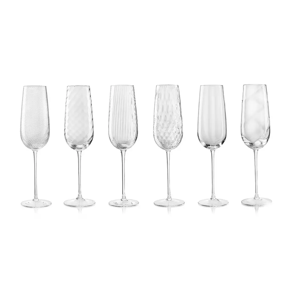 The traditional Muranese "lente" technique lends this transparent mouth-blown flute its subtle optical design. Streamlined and refined, it consists of an extra-thin pedestal silhouette crafted by hand that sustains a slightly tapered bowl entirely resulting from a masterful mouth-blowing process. Additional textures and red wine counterparts are available in the Artemest catalog.