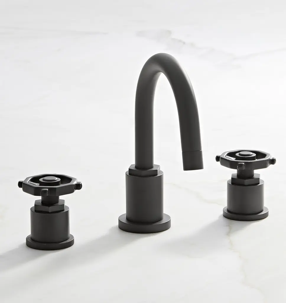 Crafted from solid brass and inspired by utilitarian styles, Tolson features unique handles designed to evoke industrial handwheels—a timeless element for your bath.
