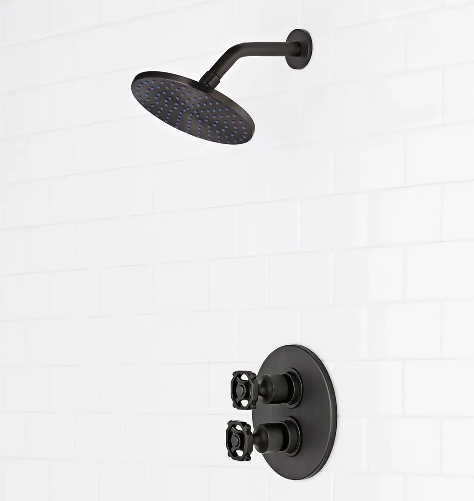Crafted from solid brass and inspired by utilitarian styles, Tolson features unique handles designed to evoke industrial handwheels—a timeless element for your bath. Our thermostatic shower sets feature dual knobs for easy, separate adjustment of temperature and water pressure—offering a superior water flow, increased energy efficiency, and consistent water temperature. Complete your set with your choice of shower head to create the ideal bath experience.