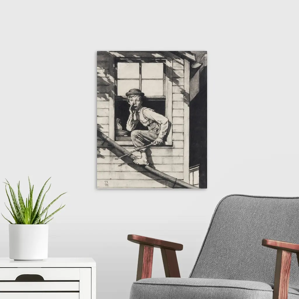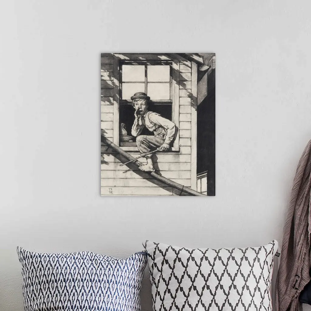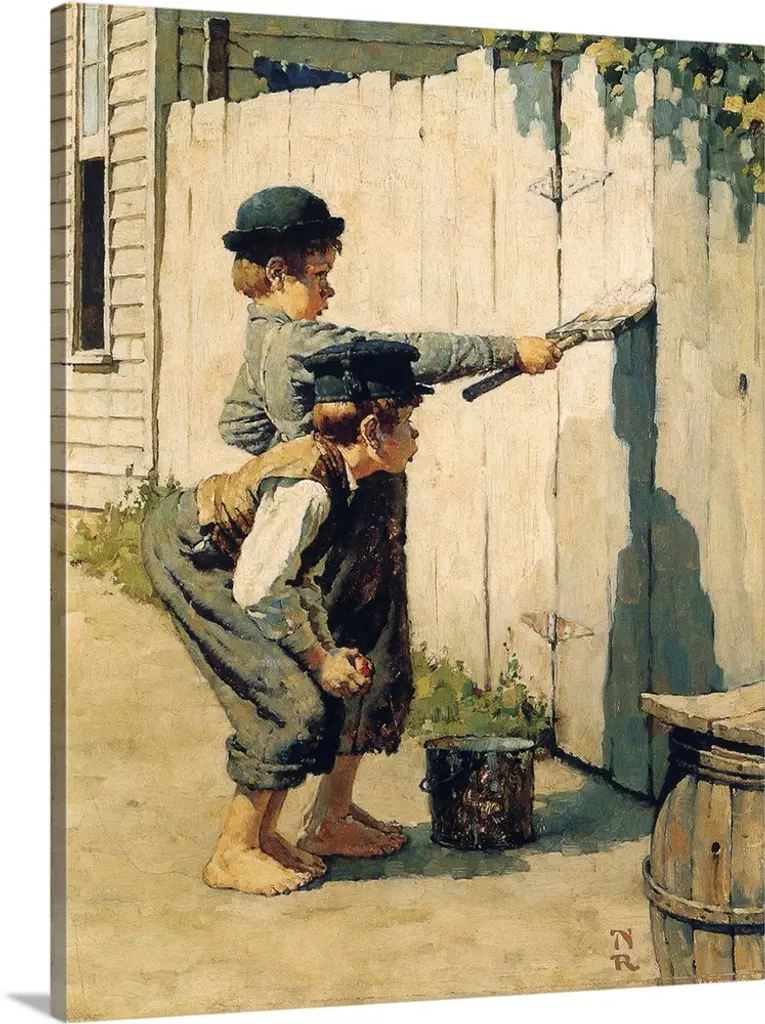 In 1935 Norman Rockwell began to illustrate Mark Twain's The Adventures of Tom Sawyer and The Adventures of Huckleberry Finn. Rockwell visited Hannibal, Missouri, Twain's boyhood town, to find authentic details to include in his work. Twain's vivid descriptions of character, setting and mood were an inspiration to the illustrator, who considered each of the writer's scenes to be "complete and perfect to the last detail." Approved by the Norman Rockwell Family Agency