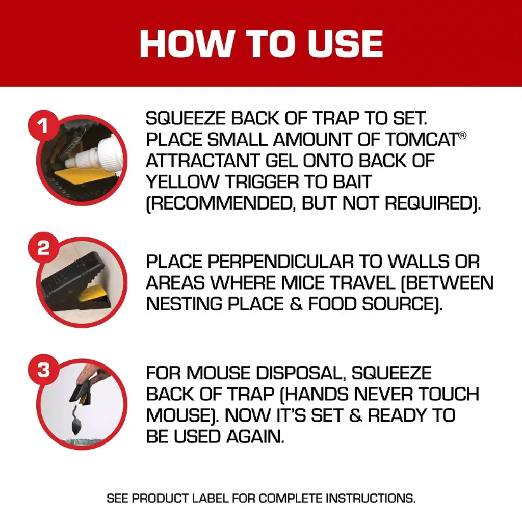 The Tomcat® Mouse Snap Traps is the pesticide-free, non-toxic way to control mice. Easy to use and easy to set, this trap is safer around kids and pets versus conventional wooden traps. You can rely on this reusable trap to effectively kill mice for clean and no-touch disposal.
