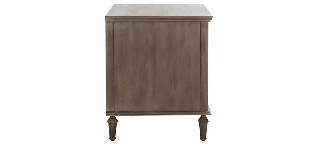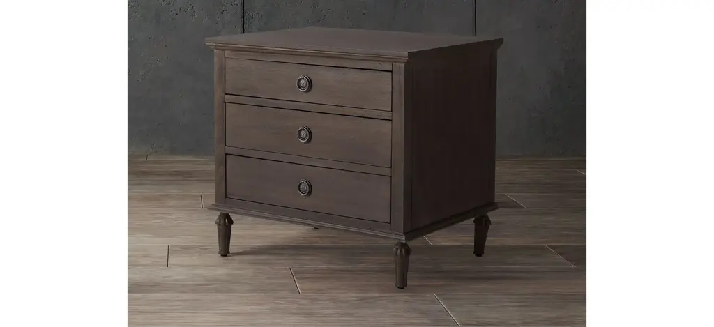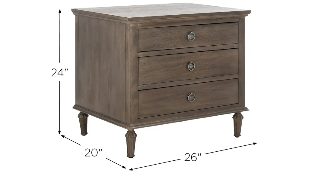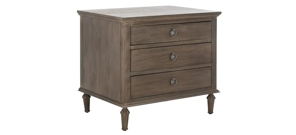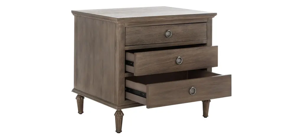 Emanating timeless French elegance, this Tomi Nightstand is a must-have for today's classic-contemporary decor. Tomi's turned and fluted legs flaunt subtle Rococo details that flourish in light brown mahogany, pairing perfectly with the antiqued silver ring pulls on its three drawer.