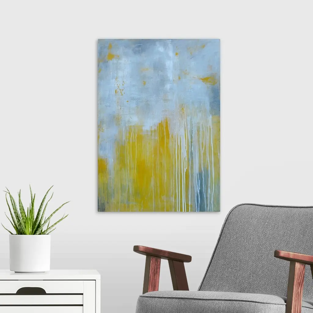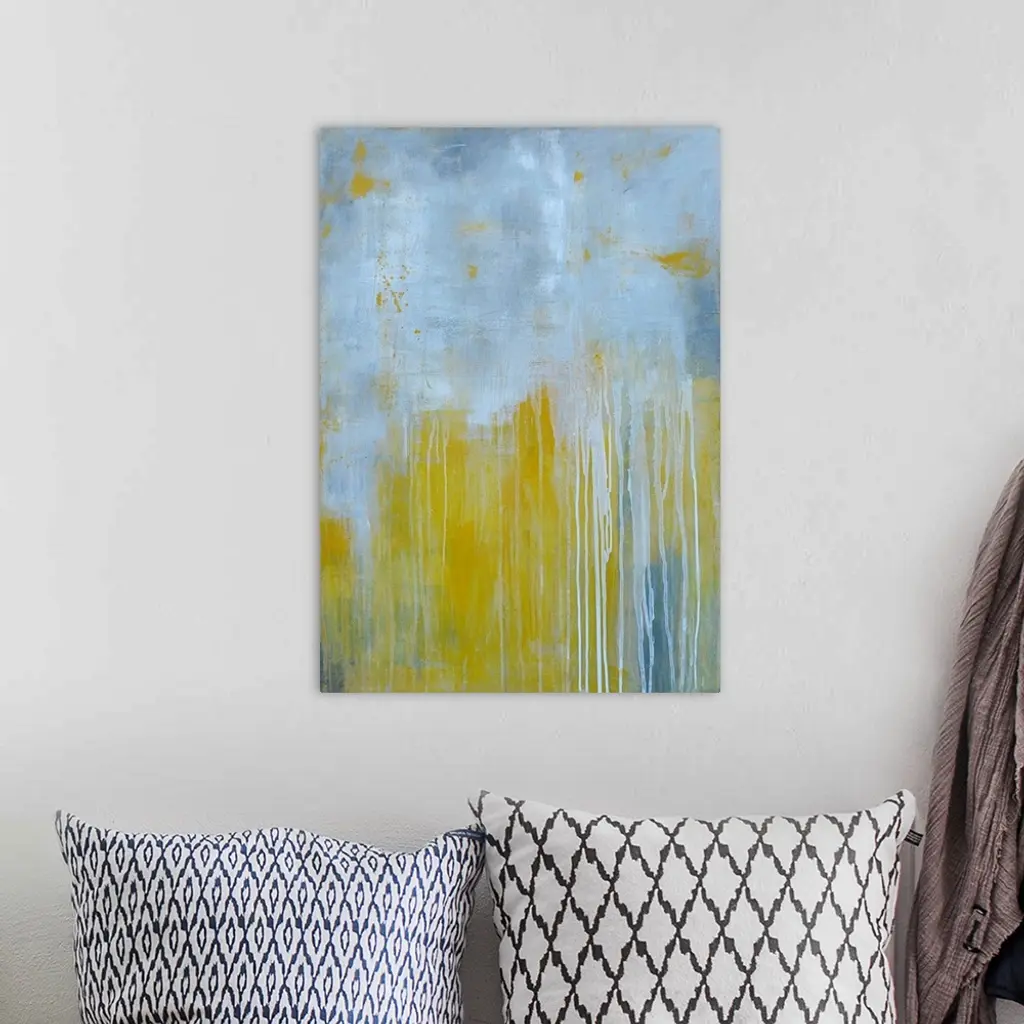 Large abstract art comprised of two fairly equal patches of muted tones running into each other. The color at the top has the effect of dripping paint towards the bottom of its section as it runs over the other color.