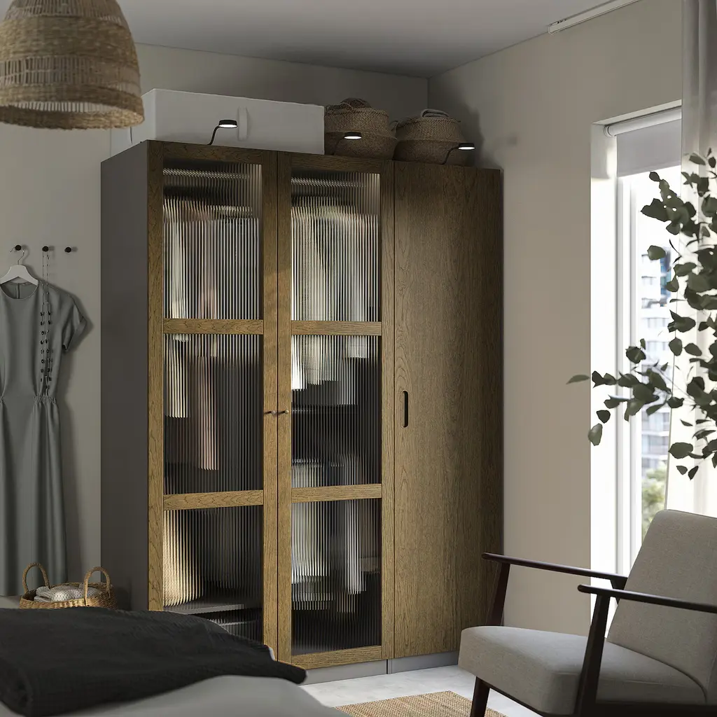TONSTAD Door - brown/stained oak veneer glass 19 5/8x76 3/4 ". This door with structured glass adds a more dynamic and vibrant look to your PAX wardrobe. Coordinates well with TONSTAD brown stained oak veneer door and PAX frame in dark-grey. To be completed with KOMPLEMENT hinges 3-pack.