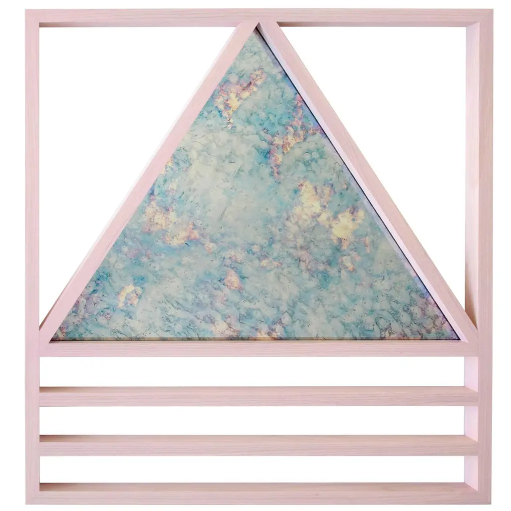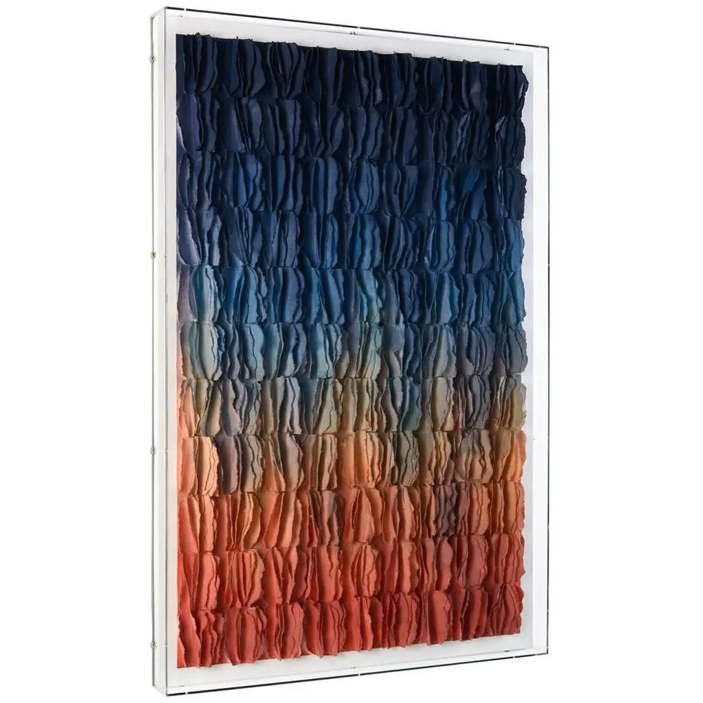 This structural piece by Tony Fey displays a flowing perspective with the interaction of movement, shapes, and shadows in blues, greens and white. The art is surrounded by an acrylic box.