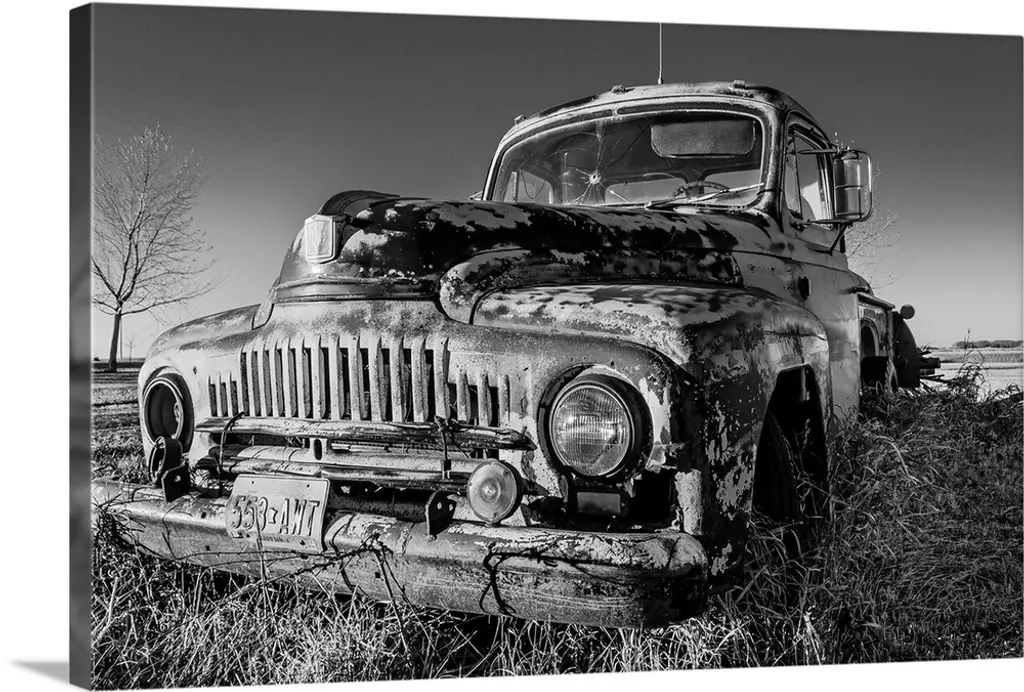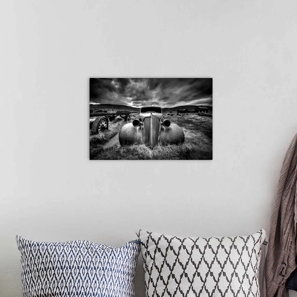 A black and white photograph of derelict vintage car sitting in a desert landscape.