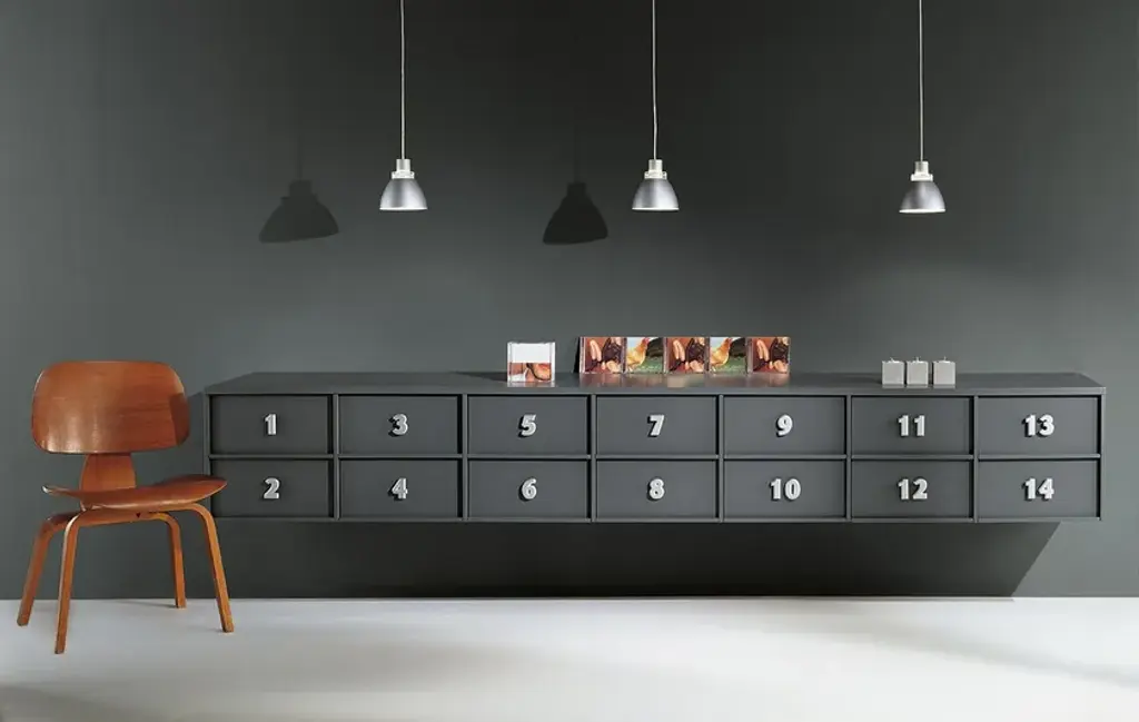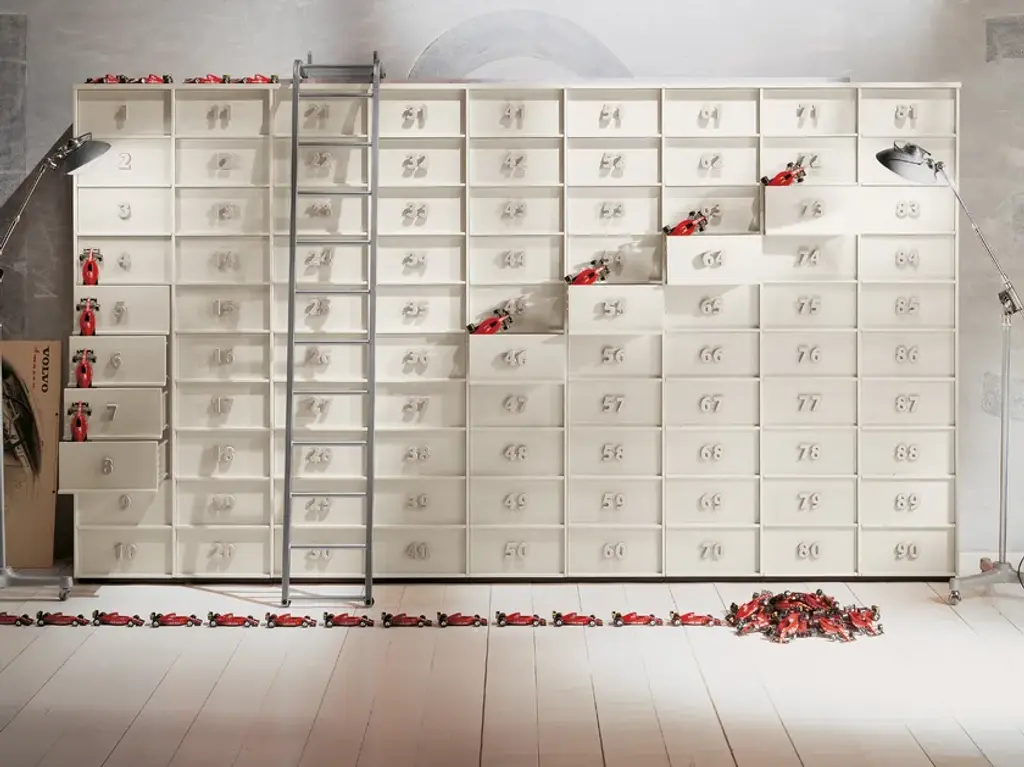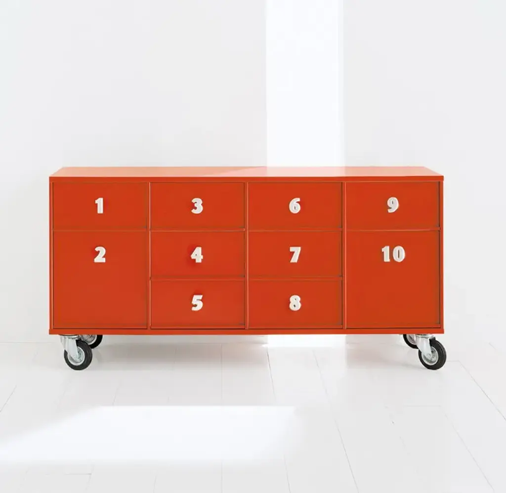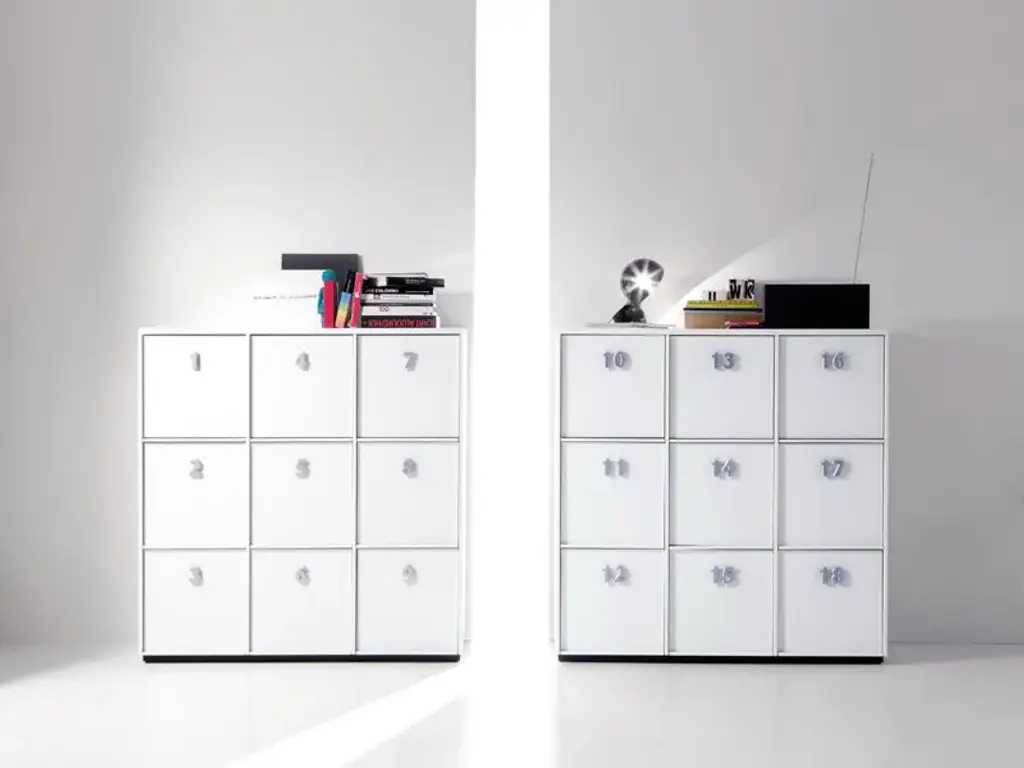 Toolbox is a modular container with drawers and/or doors, with castors or hanging, with aluminium numbered handles so you won't forget where you have put your books or your documents. Nice and always modern, Toolbox can be composed in many different combinations, with different finishes and dimensions. FINISHINGSThe external finishing is available in our selected mat lacquered colours, mat by sample. The finishing of the internal drawer is aluminium colour lacquered metal. Handle in aluminium with epoxy powder lacquer.