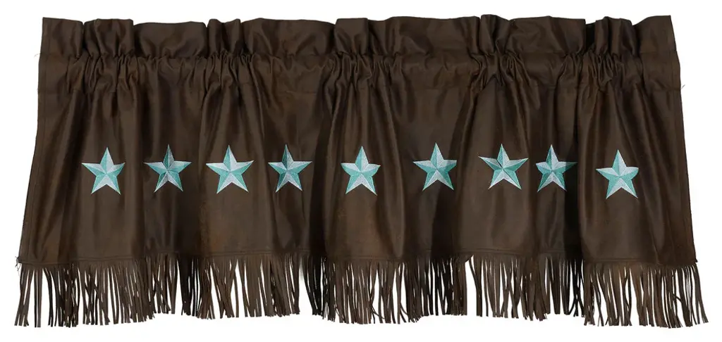 Faux tooled leather valance with faux leather fringe. The rod pocket faux tooled leather valance can be used on a standard or decorative rod and fits a single window. The valance is accented with fringe. Use multiple valances for added fullness.