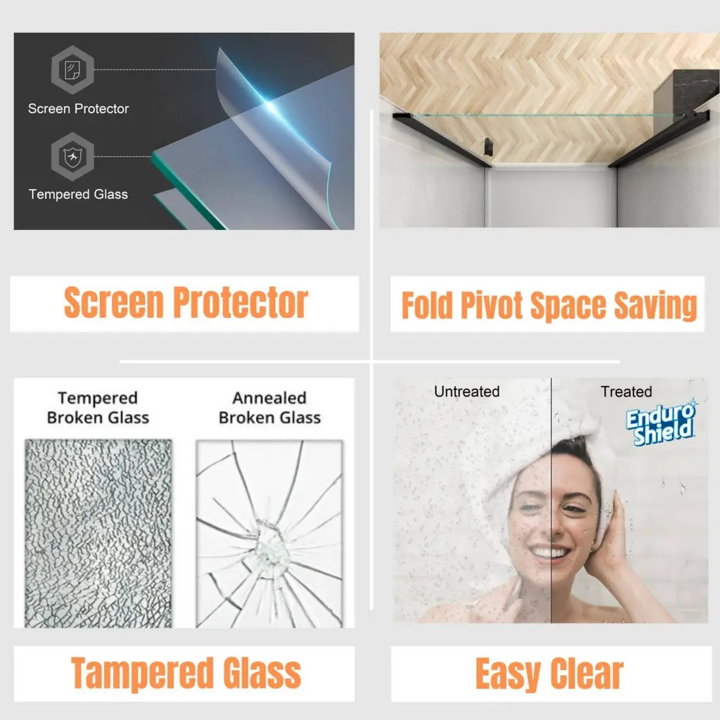 Pivot shower screen allows for a wide entry, while using minimal space. Great choice for smaller bathrooms, where a swing or sliding door will not work. Reversible for a right or left wall installation to fit your specific layout. [Prefabricated Shower Sizes specification]