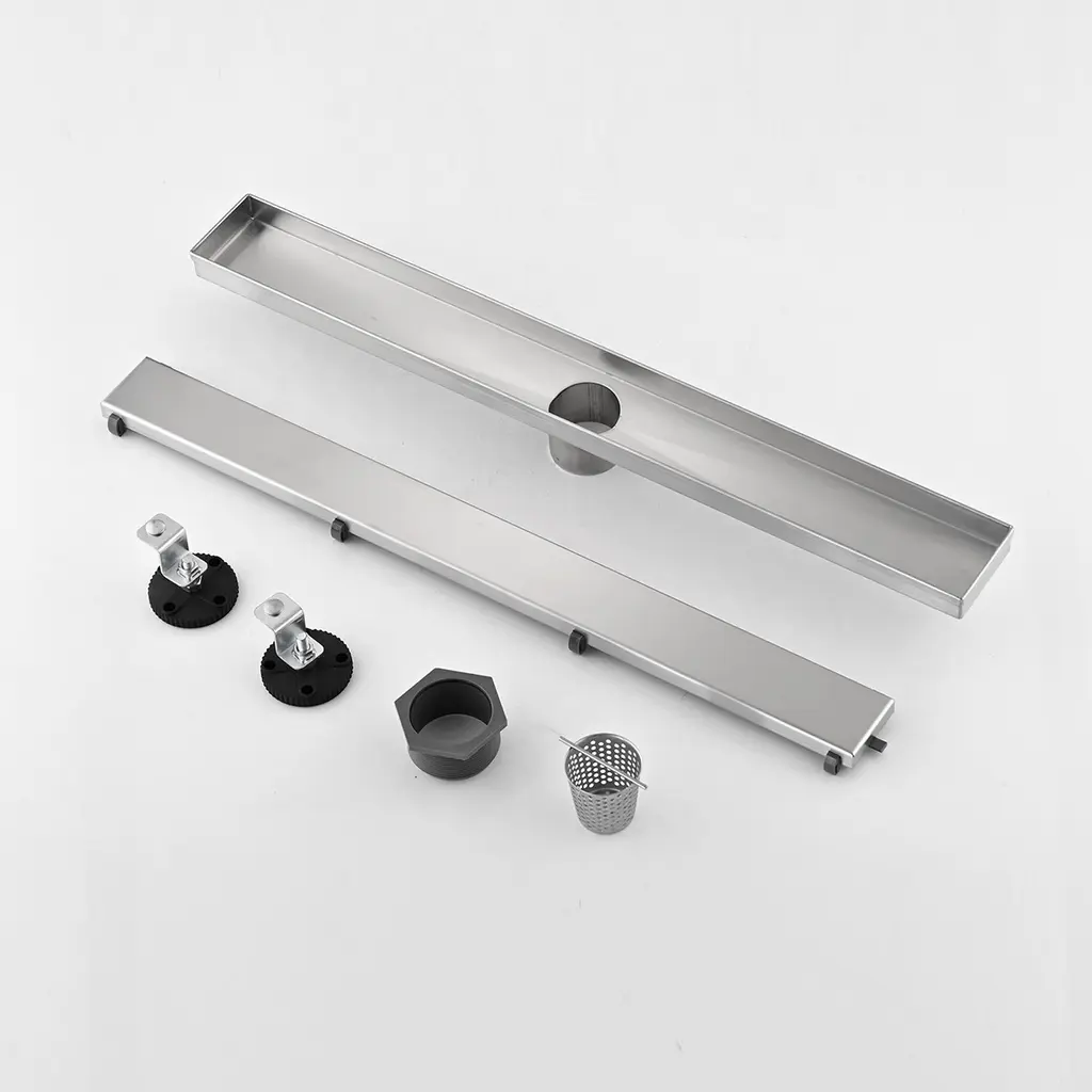 Topcraft Linear Floor Drain features a modern and sleek design that adds a touch of contemporary flair to any space in which it is used. Crafted from high quality materials, the floor drain has a sturdy and stable construction that will last for years, making it ideal for draining your bathroom. The linear shower drain has a shallow “V” profile that helps water flow quickly down the center drain, reducing residual moisture at the bottom and keeping your bathroom dry. FeatureMade of stainless steel for a sturdy construction that won't warp easily. The surface of the drain is finished with a commercial grade finish that is scratch and rust resistant. Floor drain cover is designed with a panel lid to enhance water flow. Floor tile recessed mounting for easy installation. Easy to remove and easy to clean and maintain. Includes hair filter and leveling feet, flange. Practical floor drain can be used in multiple scenarios to meet daily use needs.