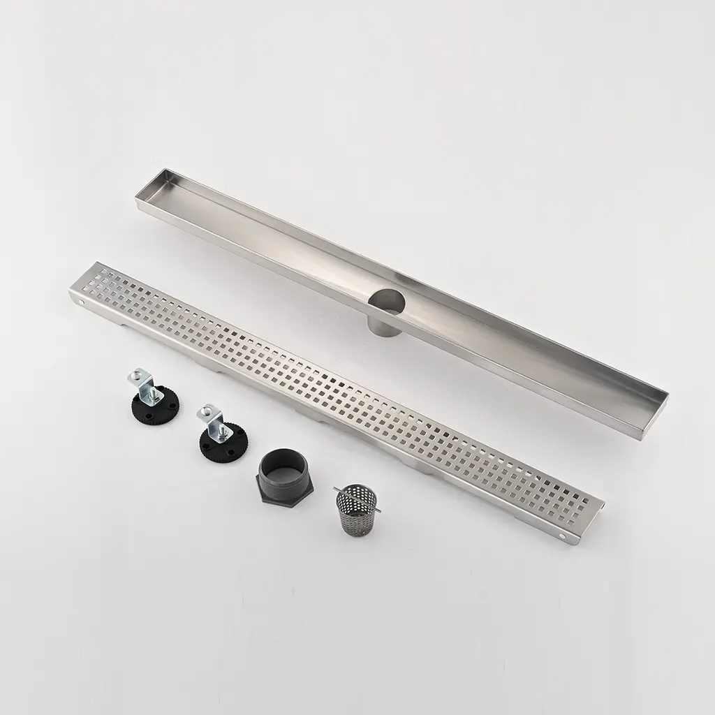 Topcraft Linear Floor Drain features a modern and sleek design that adds a touch of contemporary flair to any space in which it is used. Crafted from high quality materials, the floor drain has a sturdy and stable construction that will last for years, making it ideal for draining your bathroom. The linear shower drain has a shallow “V” profile that helps water flow quickly down the center drain, reducing residual moisture at the bottom and keeping your bathroom dry. FeatureMade of stainless steel for a sturdy construction that won't warp easily. The surface of the drain is finished with a commercial grade finish that is scratch and rust resistant.Line floor drain cover is designed with a grid lid to enhance water flow. Floor tile recessed mounting for easy installation. Easy to remove and easy to clean and maintain. Includes hair filter and leveling feet, flange. Practical floor drain can be used in multiple scenarios to meet daily use needs.