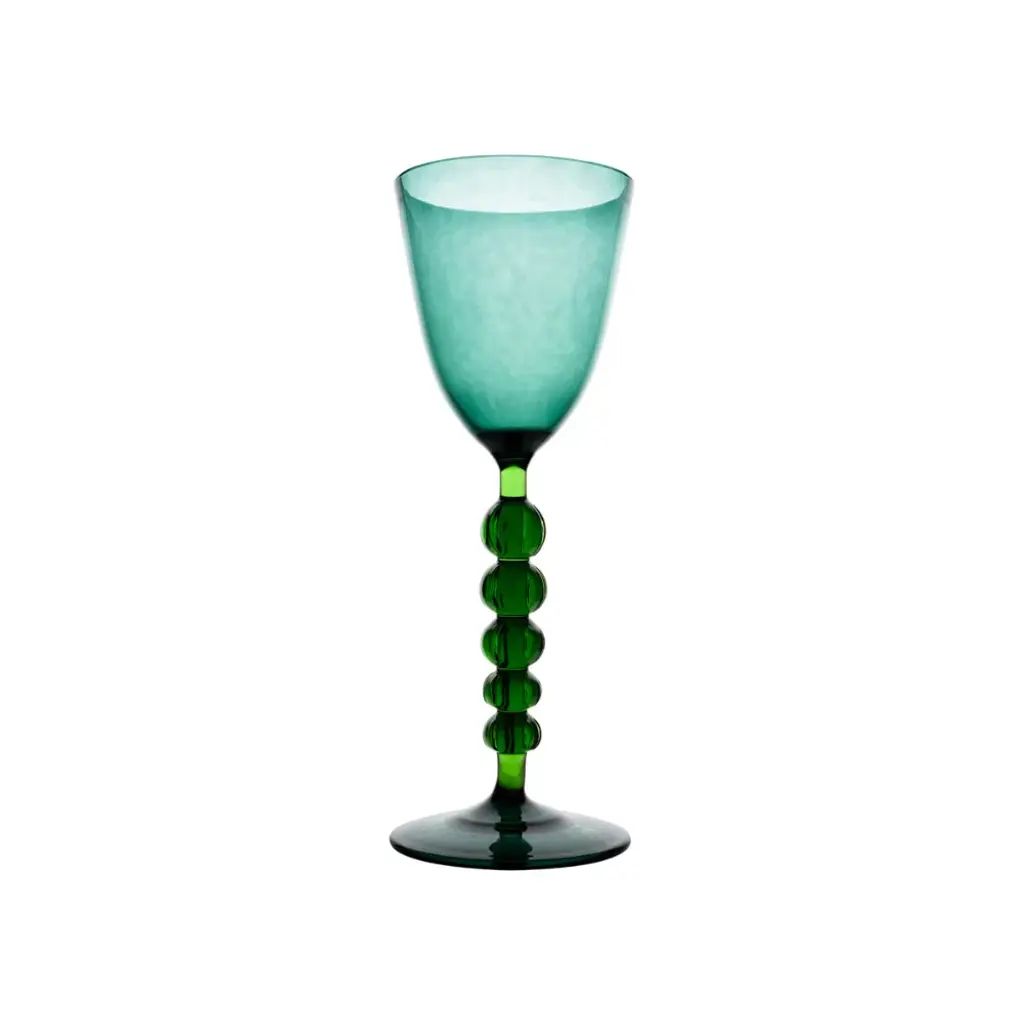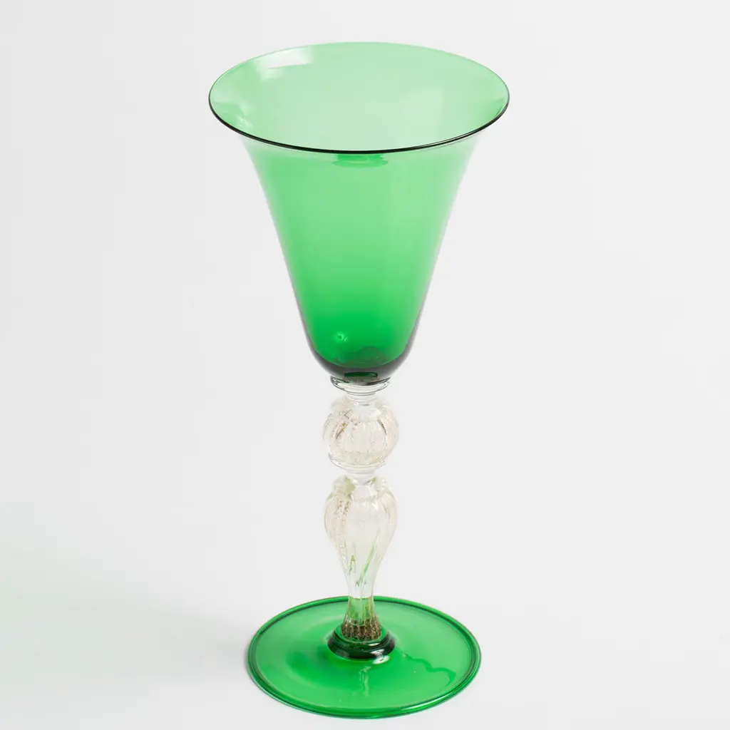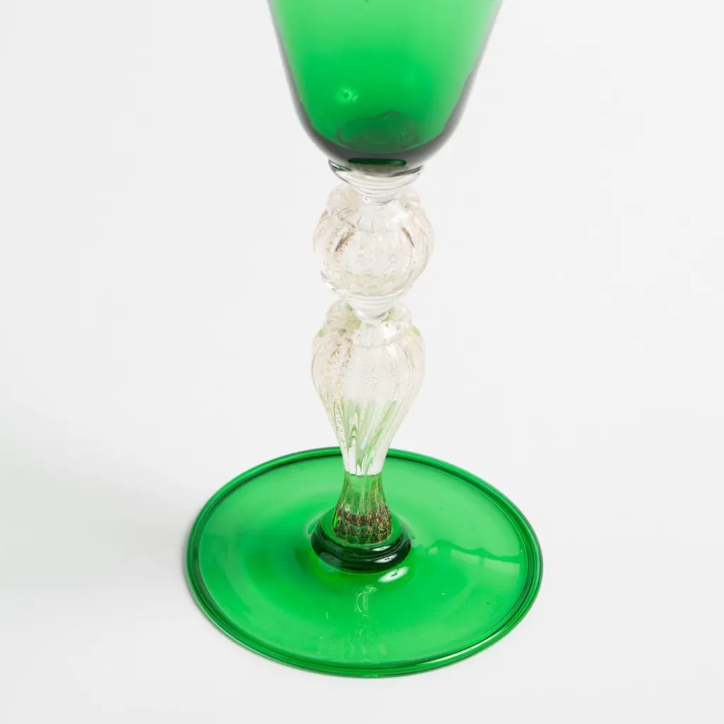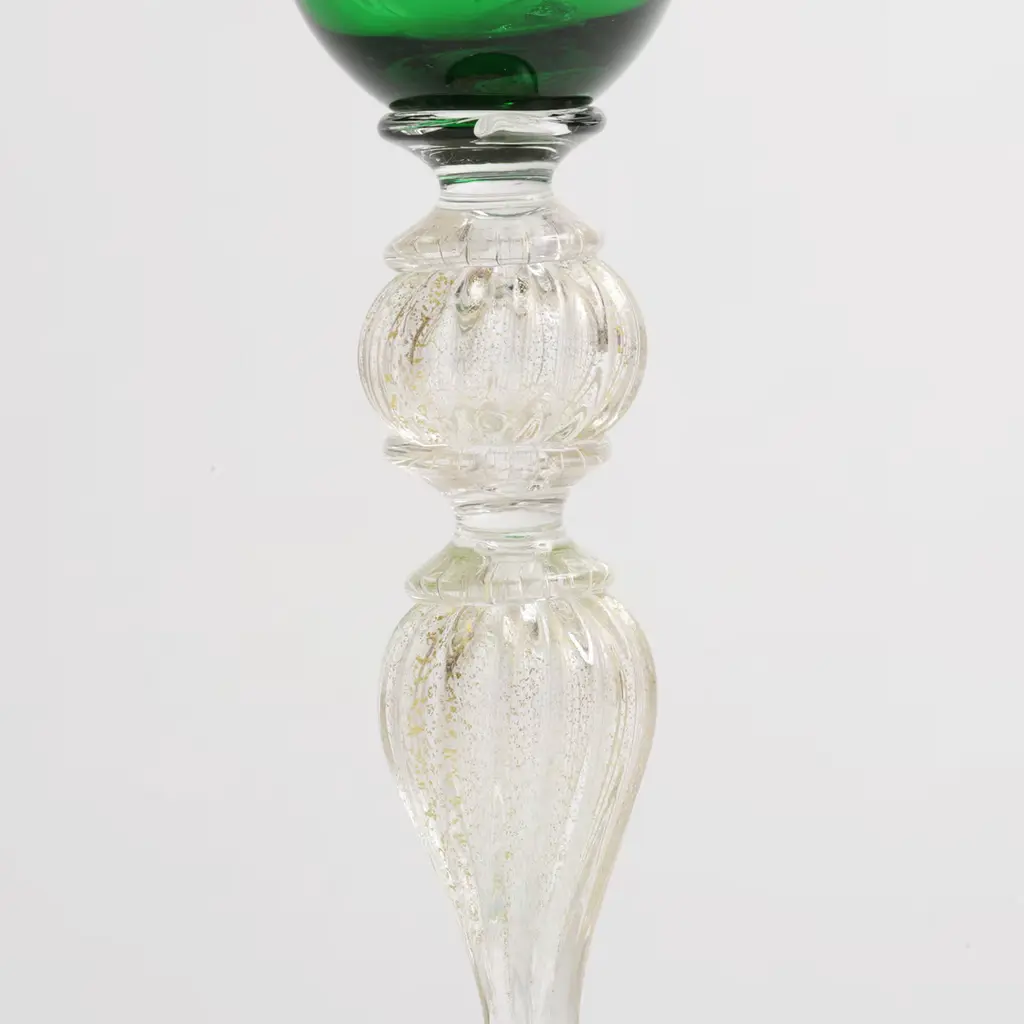 This exquisite flute in vivid green rests on a finely decorated sinuous stem in crystal color with a green base.
